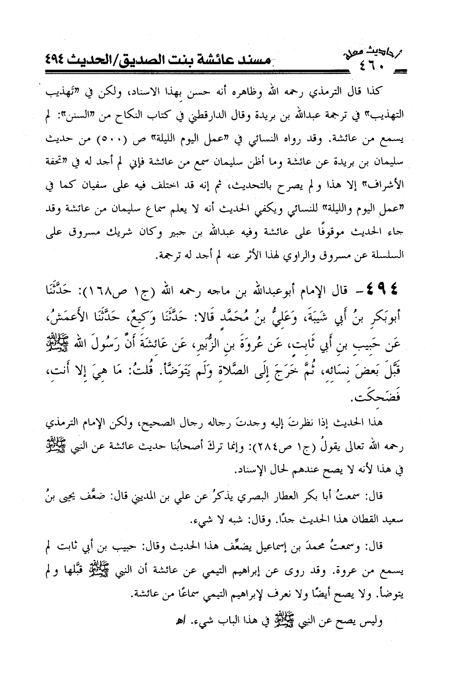 494- قال الإمام أبو عبد الله ابن ماجه رحمه الله (ج1ص168) : حَدَّثَنَا أَبُو بَكْرِ بْنُ أَبِي شَيْبَةَ وَعَلِيُّ بْنُ مُحَمَّدٍ قَالَا حَدَّثَنَا وَكِيعٌ حَدَّثَنَا الْأَعْمَشُ عَنْ حَبِيبِ بْنِ أَبِي ثَابِتٍ عَنْ عُرْوَةَ بْنِ الزُّبَيْرِ عَنْ عَائِشَةَ أَنَّ رَسُولَ اللَّهِ صَلَّى اللَّهُ عَلَيْهِ وَعَلَىَ آلِهِ وَسَلَّمَ قَبَّلَ بَعْضَ نِسَائِهِ ثُمَّ خَرَجَ إِلَى الصَّلَاةِ وَلَمْ يَتَوَضَّأْ قُلْتُ مَا هِيَ إِلَّا أَنْتِ فَضَحِكَتْ