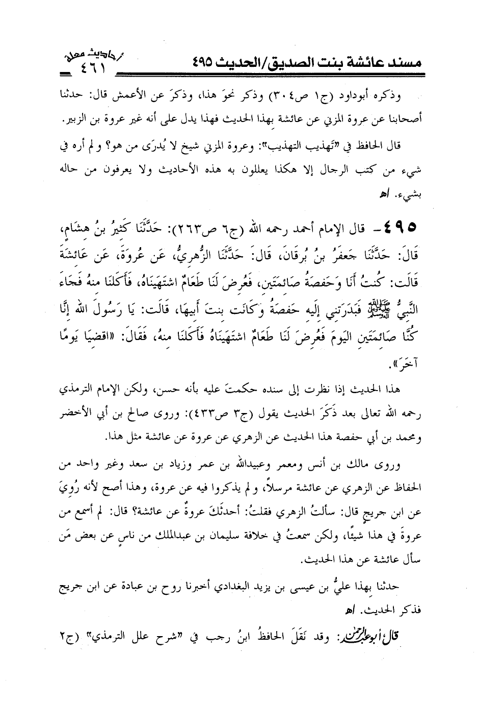 هذا الحديث إذا نظرت إلى سنده حكمت عليه بأنه حسن، ولكن الإمام الترمذي رحمه الله بعد ذكر الحديث يقول (ج3ص433) : وروى صالح بن أبي الأخضر ومحمد بن أبي حفصة هذا الحديث عن الزهري عن عروة عن عائشة مثل هذا ورواه مالك بن أنس ومعمر وعبيد الله بن عمر وزياد بن سعد وغير واحد من الحفاط عن الزهري عن عائشة مرسلاً ولم يذكروا فيه عن عروة وهذا أصح لأنه روي عن ابن جريج قال سألت الزهري قلت له أحدثك عروة عن عائشة قال لم أسمع من عروة في هذا شيء ولكني سمعت في خلافة سليمان بن عبد الملك من ناس عن بعض من سأل عائشة عن هذا الحديث حدثنا بذلك علي بن عيسى بن يزيد البغدادي حدثنا روح بن عبادة عن ابن جريج فذكر الحديث. اهـ