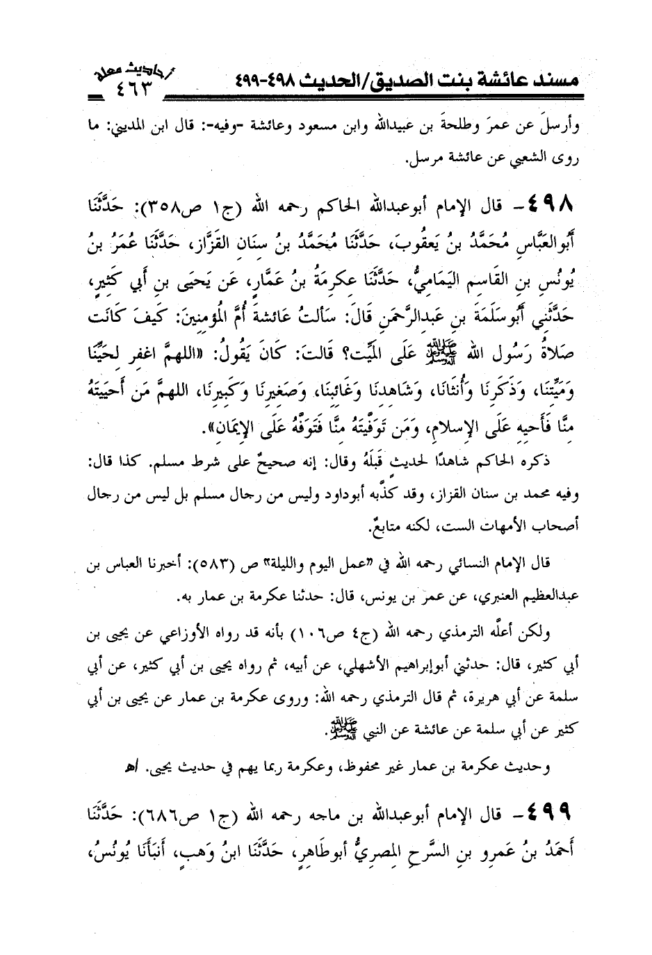 498- قال الإمام أبو عبد الله الحاكم رحمه الله (ج1ص358) : حدثنا أبو العباس محمد بن يعقوب ثنا محمد بن سنان القزاز ثنا عمرو بن يونس بن القاسم اليمامي ثنا عكرمة بن عمار عن يحيى بن أبي كثير حدثني أبو سلمة بن عبد الرحمن قال: سألت عائشة أم المؤمنين كيف كانت صلاة رسول الله صَلَّى اللَّهُ عَلَيْهِ وَعَلَىَ آلِهِ وَسَلَّمَ على الميت؟ قالت: كان يقول: اللهم اغفر لحينا وميتنا وذكرنا وأنثانا وشاهدنا وغائبنا وصغيرنا وكبيرنا اللهم من أحييته منا فأحيه على الإسلام ومن توفيته منا فتوفه على الإيمان) .