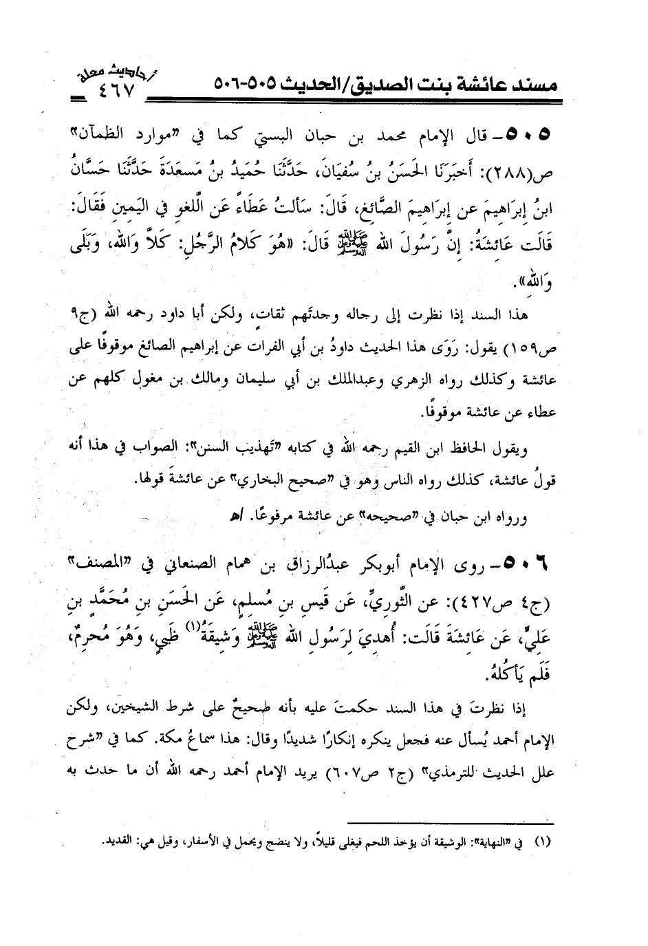هذا السند إذا نظرت إلى رجاله وجدتهم ثقات، ولكن أبا داود رحمه الله (ج9ص159) يقول: روى هذا الحديث داود بن أبي الفرات عن إبراهيم الصائغ موقوفاً على عائشة وكذلك رواه الزهري وعبد الملك بن أبي سليمان ومالك بن مغول كلهم عن عطاء عن عائشة موقوفاً.