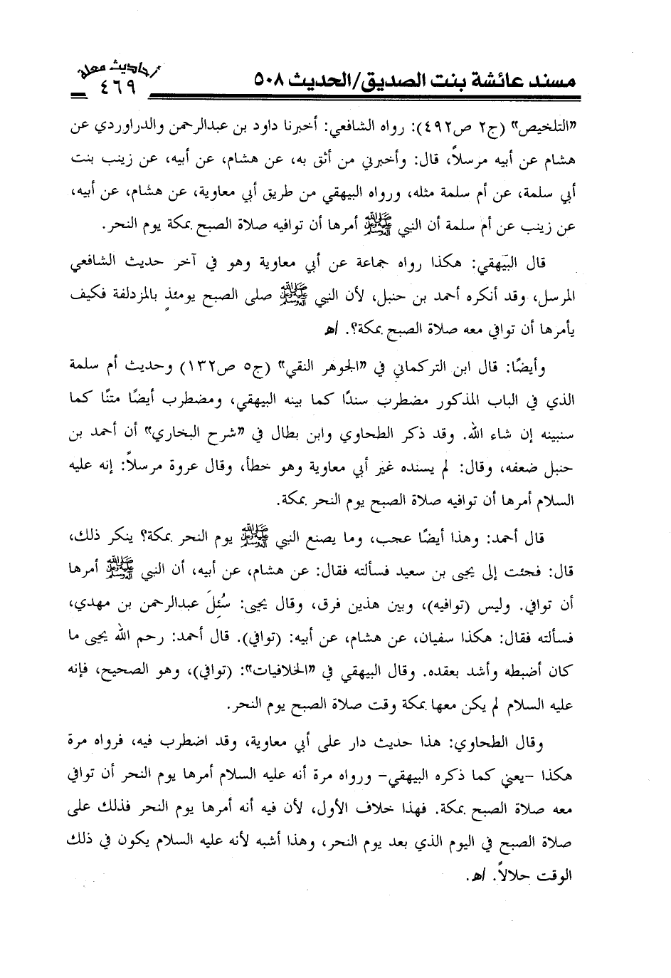 وأيضاً قال ابن التركماني في"الجوهر النقي" (ج5ص132) : وحديث أم سلمة الذي في الباب المذكور مضطرب سنداً كما بينه البيهقي ومضطرب أيضاً متناً كما سنبينه إن شاء الله تعالى وقد ذكر الطحاوي وابن بطال في شرح البخاري أن أحمد بن حنبل ضعفه وقال لم يسنده غير أبى معاوية وهو خطأ وقال عروة مرسلاً انه عليه السلام أمرها أن توافيه صلاة الصبح يوم النحر بمكة.