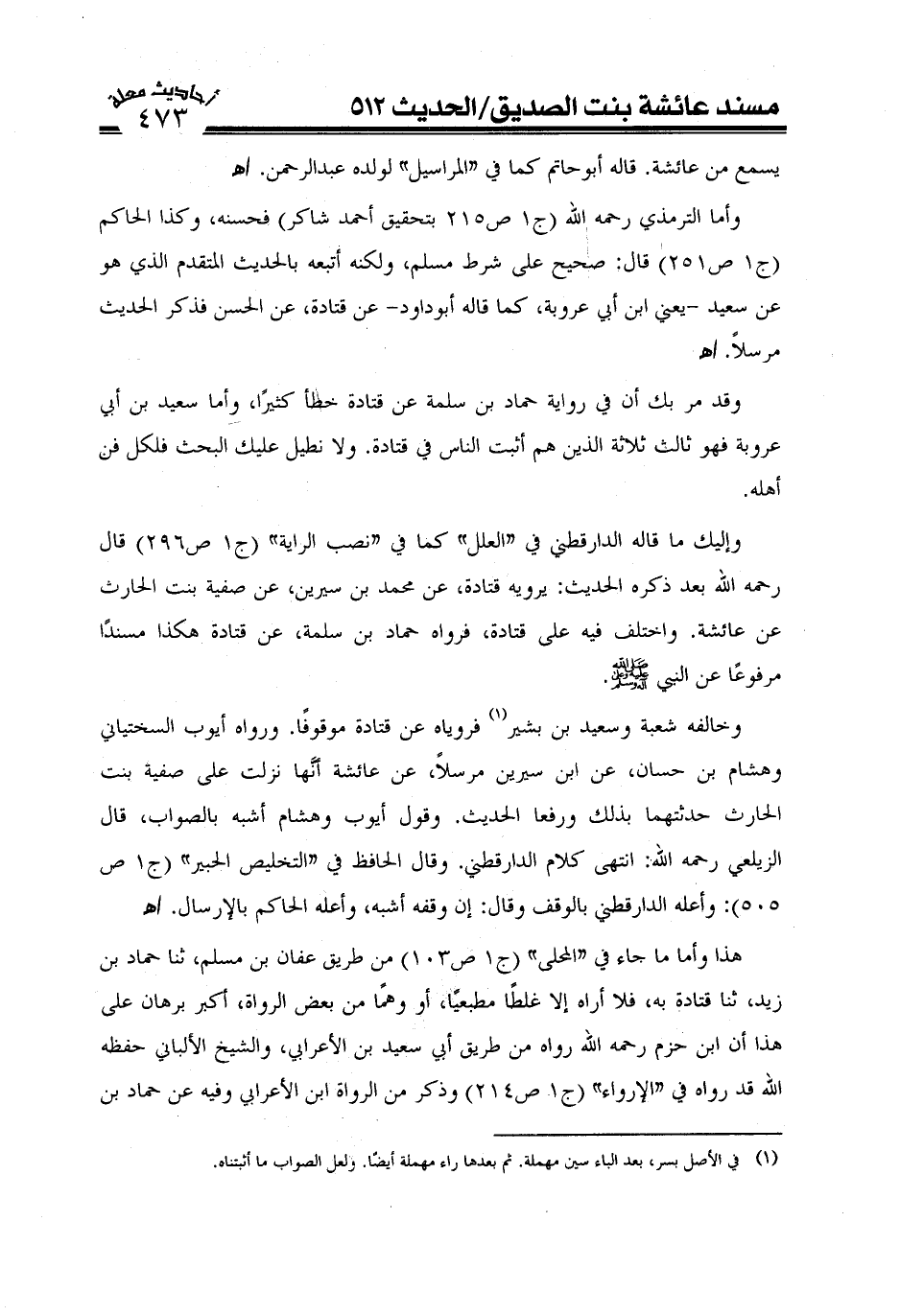 وإليك ما قاله الدارقطني في "العلل" كما في "نصب الراية" (ج1ص296) قال رحمه الله بعد ذكره الحديث: يرويه قتادة عن محمد بن سيرين عن صفية بنت الحارث عن محمد عائشة، واختلف فيه على قتادة، فرواه حماد بن سلمة عن قتادة هكذا، مسنداً مرفوعاً عن النبي صَلَّى اللَّهُ عَلَيْهِ وعلى آله وَسَلَّمَ.