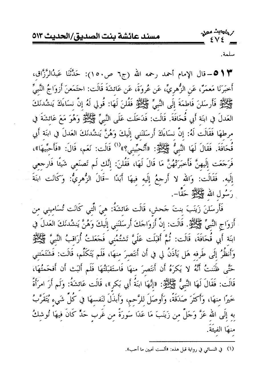 513- قال الإمام أحمد رحمه الله (ج6ص150) : حَدَّثَنَا عَبْدُ الرَّزَّاقِ أَخْبَرَنَا مَعْمَرٌ عَنِ الزُّهْرِيِّ عَنْ عُرْوَةَ عَنْ عَائِشَةَ قَالَتْ اجْتَمَعْنَ أَزْوَاجُ النَّبِيِّ صَلَّى اللَّهُ عَلَيْهِ وعلى آله وَسَلَّمَ فَأَرْسَلْنَ فَاطِمَةَ إِلَى النَّبِيِّ صَلَّى اللَّهُ عَلَيْهِ وَعَلَىَ آلِهِ وَسَلَّمَ فَقُلْنَ لَهَا قُولِي لَهُ إِنَّ نِسَاءَكَ يَنْشُدْنَكَ الْعَدْلَ فِي ابْنَةِ أَبِي قُحَافَةَ قَالَتْ فَدَخَلَتْ عَلَى النَّبِيِّ صَلَّى اللَّهُ عَلَيْهِ وعلى آله وَسَلَّمَ وَهُوَ مَعَ عَائِشَةَ فِي مِرْطِهَا فَقَالَتْ لَهُ إِنَّ نِسَاءَكَ أَرْسَلْنَنِي إِلَيْكَ وَهُنَّ يَنْشُدْنَكَ الْعَدْلَ فِي ابْنَةِ أَبِي قُحَافَةَ فَقَالَ لَهَا النَّبِيُّ صَلَّى اللَّهُ عَلَيْهِ وَعَلَىَ آلِهِ وَسَلَّمَ أَتُحِبِّينِي (¬1) قَالَتْ نَعَمْ قَالَ فَأَحِبِّيهَا فَرَجَعَتْ إِلَيْهِنَّ فَأَخْبَرَتْهُنَّ مَا قَالَ لَهَا فَقُلْنَ إِنَّكِ لَمْ تَصْنَعِي شَيْئًا فَارْجِعِي إِلَيْهِ فَقَالَتْ وَاللَّهِ لَا أَرْجِعُ إِلَيْهِ فِيهَا أَبَدًا -قَالَ الزُّهْرِيُّ وَكَانَتْ ابْنَةَ رَسُولِ اللَّهِ صَلَّى اللَّهُ عَلَيْهِ وعلى آله وَسَلَّمَ حَقًّا -.