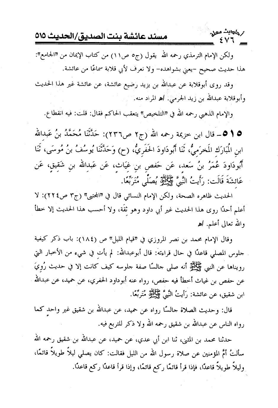 515-قال ابن خزيمة رحمه الله (ج2ص236) : حدثنا محمد بن عبد الله بن المبارك المخرمي ثنا أبو داود الحفري (ح) وثنا يوسف بن موسى ثنا أبو داود عمر بن سعد عن حفص بن غياث عن حميد عن عبد الله بن شقيق عن عائشة قالت: رأيت النبي صَلَّى اللَّهُ عَلَيْهِ وَعَلَىَ آلِهِ وَسَلَّمَ يصلي متربعاً) .