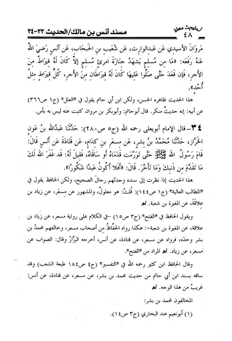 34-قال الإمام أبو يعلى رحمه الله (ج5ص280) :: حَدَّثَنَا عَبْدُ اللَّهِ بْنُ عَوْنٍ الْخَرَّازُ، حَدَّثَنَا مُحَمَّدُ بْنُ بِشْرٍ عَنْ مِسْعَرِ بْنِ كِدَامٍ، عَنْ قَتَادَةَ، عَنْ أَنَسٍ قَالَ قَامَ رَسُولُ اللَّهِ صلى الله عليه وعلى آله وسلم حَتَّى تَوَرَّمَتْ قَدَمَاهُ، أَوْ سَاقَاهُ فَقِيلَ لَهُ أَلَيْسَ قَدْ غَفَرَ اللَّهُ لَكَ مَا تَقَدَّمَ مِنْ ذَنْبِكَ وَمَا تَأَخَّرَ قَالَ أَفَلا أَكُونُ عَبْدًا شَكُورًا.