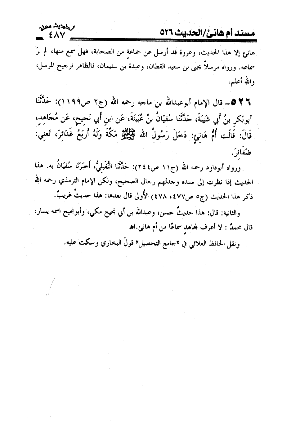 526- قال الإمام أبو عبد الله ابن ماجه رحمه الله (ج2ص1199) : حَدَّثَنَا أَبُو بَكْرِ بْنُ أَبِي شَيْبَةَ حَدَّثَنَا سُفْيَانُ بْنُ عُيَيْنَةَ عَنْ ابْنِ أَبِي نَجِيحٍ عَنْ مُجَاهِدٍ قَالَ قَالَتْ أُمُّ هَانِئٍ دَخَلَ رَسُولُ اللَّهِ صَلَّى اللَّهُ عَلَيْهِ وَعَلَىَ آلِهِ وَسَلَّمَ مَكَّةَ وَلَهُ أَرْبَعُ غَدَائِرَ تَعْنِي ضَفَائِرَ) .