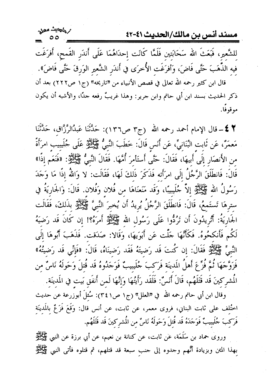 42-قال الإمام أحمد رحمه الله (ج3ص136) : حَدَّثَنَا عَبْدُ الرَّزَّاقِ حَدَّثَنَا مَعْمَرٌ عَنْ ثَابِتٍ الْبُنَانِيِّ عَنْ أَنَسٍ قَالَ: خَطَبَ النَّبِيُّ صَلَّى اللَّهُ عَلَيْهِ وعلى آله وَسَلَّمَ عَلَى جُلَيْبِيبٍ امْرَأَةً مِنْ الْأَنْصَارِ إِلَى أَبِيهَا فَقَالَ حَتَّى أَسْتَأْمِرَ أُمَّهَا فَقَالَ النَّبِيُّ صَلَّى اللَّهُ عَلَيْهِ وعلى آله وَسَلَّمَ فَنَعَمْ إِذًا قَالَ فَانْطَلَقَ الرَّجُلُ إِلَى امْرَأَتِهِ فَذَكَرَ ذَلِكَ لَهَا فَقَالَتْ لَاهَا اللَّهُ إِذًا مَا وَجَدَ رَسُولُ اللَّهِ صَلَّى اللَّهُ عَلَيْهِ وعلى آله وَسَلَّمَ إِلَّا جُلَيْبِيبًا وَقَدْ مَنَعْنَاهَا مِنْ فُلَانٍ وَفُلَانٍ قَالَ وَالْجَارِيَةُ فِي سِتْرِهَا تَسْتَمِعُ قَالَ فَانْطَلَقَ الرَّجُلُ يُرِيدُ أَنْ يُخْبِرَ النَّبِيَّ صَلَّى اللَّهُ عَلَيْهِ وعلى آله وَسَلَّمَ بِذَلِكَ فَقَالَتْ الْجَارِيَةُ أَتُرِيدُونَ أَنْ تَرُدُّوا عَلَى رَسُولِ اللَّهِ صَلَّى اللَّهُ عَلَيْهِ وعلى آله وَسَلَّمَ أَمْرَهُ إِنْ كَانَ قَدْ رَضِيَهُ لَكُمْ فَأَنْكِحُوهُ فَكَأَنَّهَا جَلَّتْ عَنْ أَبَوَيْهَا وَقَالَا صَدَقْتِ فَذَهَبَ أَبُوهَا إِلَى النَّبِيِّ صَلَّى اللَّهُ عَلَيْهِ وعلى آله وَسَلَّمَ فَقَالَ إِنْ كُنْتَ قَدْ رَضِيتَهُ فَقَدْ رَضِينَاهُ قَالَ فَإِنِّي قَدْ رَضِيتُهُ فَزَوَّجَهَا ثُمَّ فُزِّعَ أَهْلُ الْمَدِينَةِ فَرَكِبَ جُلَيْبِيبٌ فَوَجَدُوهُ قَدْ قُتِلَ وَحَوْلَهُ نَاسٌ مِنْ الْمُشْرِكِينَ قَدْ قَتَلَهُمْ. قَالَ أَنَسٌ: فَلَقَدْ رَأَيْتُهَا وَإِنَّهَا لَمِنْ أَنْفَقِ بَيْتٍ فِي الْمَدِينَةِ.