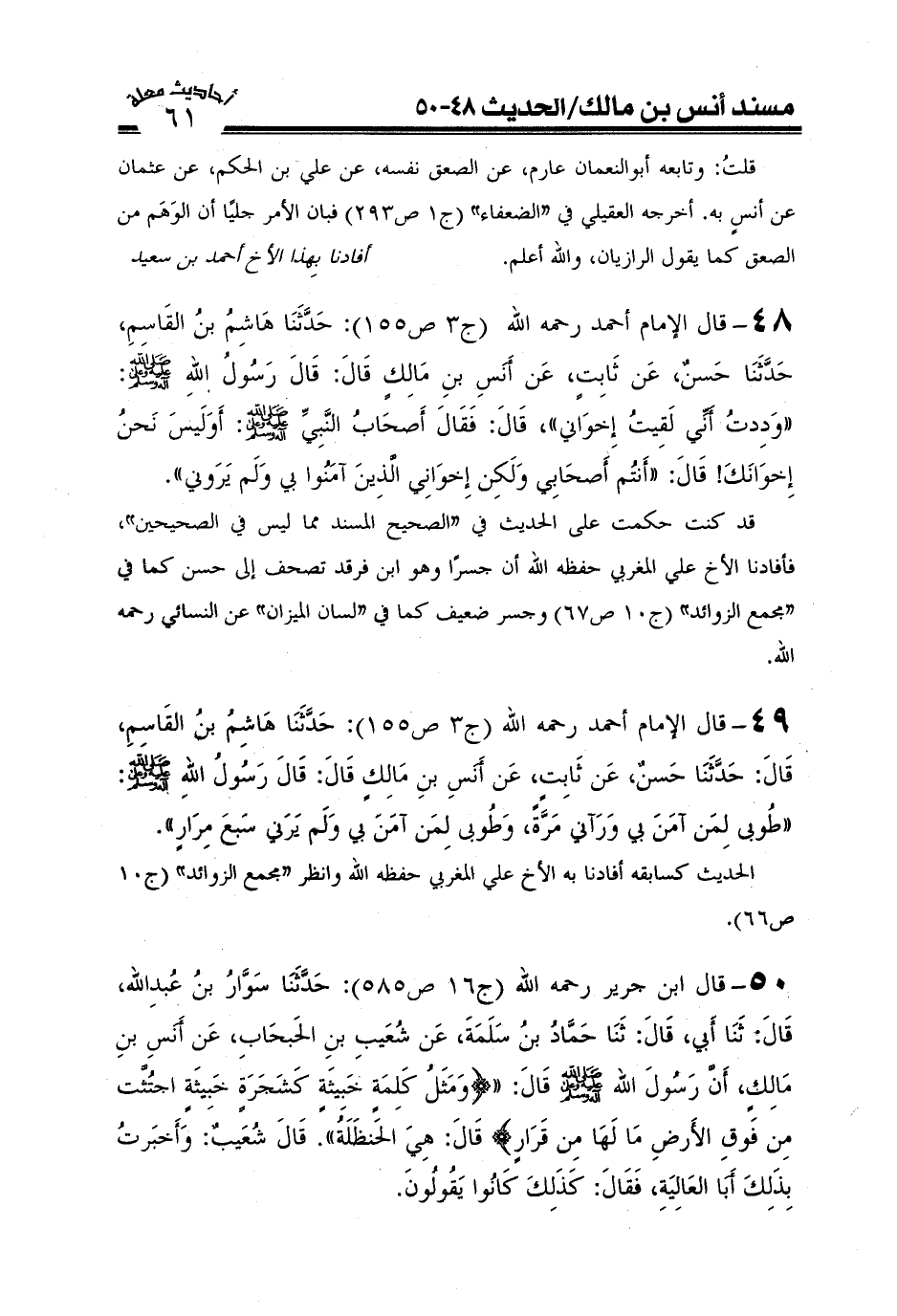 49-قال الإمام أحمد رحمه الله (ج3ص155) : حَدَّثَنَا هَاشِمُ بْنُ الْقَاسِمِ قَالَ حَدَّثَنَا جَسْرٌ عَنْ ثَابِتٍ عَنْ أَنَسِ بْنِ مَالِكٍ قَالَ: قَالَ رَسُولُ اللَّهِ صَلَّى اللَّهُ عَلَيْهِ وعلى آله وَسَلَّمَ طُوبَى لِمَنْ آمَنَ بِي وَرَآنِي مَرَّةً وَطُوبَى لِمَنْ آمَنَ بِي وَلَمْ يَرَنِي سَبْعَ مِرَارٍ.