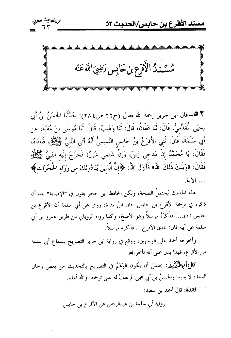 52- قال ابن جرير رحمه الله (ج22ص 284) : حدثنا الحسن بن أبي يحيى المقدمي، قال: ثنا عفان، قال: ثنا وُهَيب، قال: ثنا موسى بن عقبة، عن أبي سَلَمة، قال: ثني الأقرع بن حابس التميميّ أنه أتى النبيّ صَلَّى اللَّهُ عَلَيْهِ وعلى آله وَسَلَّمَ، فناداه، فقال: يا محمد إن مدحي زين، وإن شتمي شين; فخرج إليه النبي صَلَّى اللَّهُ عَلَيْهِ وعلى آله وَسَلَّمَ فقال: وَيْلَكَ ذَلِكَ اللهُ، فأنزل الله (إِنَّ الَّذِينَ يُنَادُونَكَ مِنْ وَرَاءِ الْحُجُرَاتِ) ... الآية.