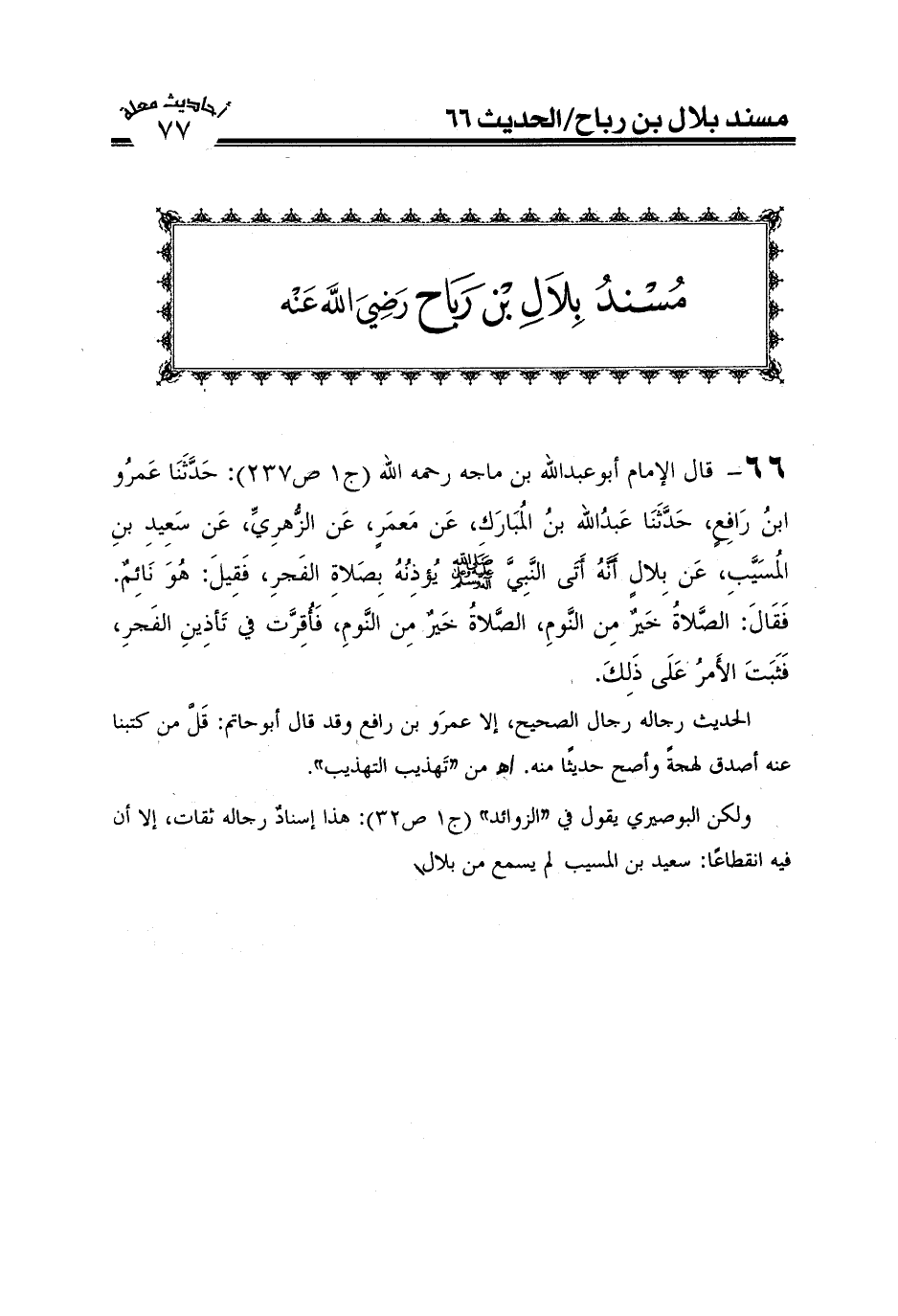 66- قال أبو عبد الله بن ماجه رحمه اله (ج1ص237) : حَدَّثَنَا عَمْرُو بْنُ رَافِعٍ حَدَّثَنَا عَبْدُ اللَّهِ بْنُ الْمُبَارَكِ عَنْ مَعْمَرٍ عَنْ الزُّهْرِيِّ عَنْ سَعِيدِ بْنِ الْمُسَيَّبِ عَنْ بِلَالٍ أَنَّهُ أَتَى النَّبِيَّ صَلَّى اللَّهُ عَلَيْهِ وعلى آله وَسَلَّمَ يُؤْذِنُهُ بِصَلَاةِ الْفَجْرِ فَقِيلَ هُوَ نَائِمٌ فَقَالَ الصَّلَاةُ خَيْرٌ مِنْ النَّوْمِ الصَّلَاةُ خَيْرٌ مِنْ النَّوْمِ فَأُقِرَّتْ فِي تَأْذِينِ الْفَجْرِ فَثَبَتَ الْأَمْرُ عَلَى ذَلِكَ.