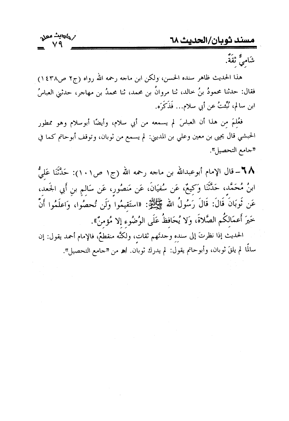 فعُلِمَ من هذا أن العباس لم يسمعه من أبى سلام، وأيضاً أبو سلام وهو ممطور الحبشي قال يحيى ابن معين وعلى بن المدينى: لم يسمع من ثوبان، وتوقف أبو حاتم كما في "جامع التحصيل".