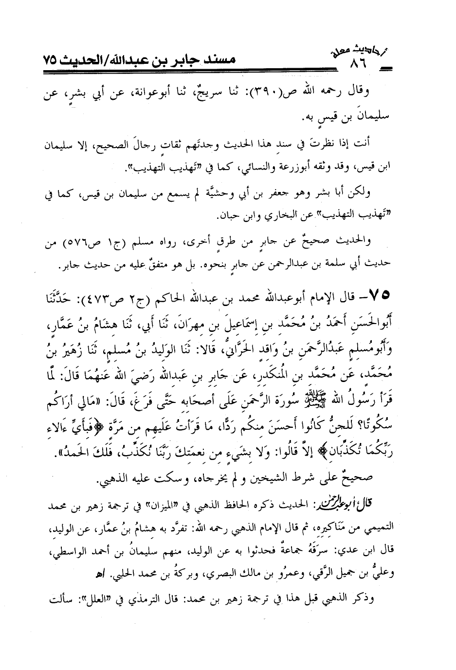 حدثنا أبو الحسن أحمد بن محمد بن إسماعيل بن مهران، ثنا أبي، ثنا هشام بن عمار، وأبو مسلم عبد الرحمن بن واقد الحراني قالا: ثنا الوليد بن مسلم، ثنا زهير بن محمد، عن محمد بن المنكدر، عن جابر بن عبد الله رضي الله عنهما، قال: لما قرأ رسول الله صَلَّى اللَّهُ عَلَيْهِ وعلى آله وَسَلَّمَ سورة الرحمن على أصحابه حتى فرغ قال: " ما لي أراكم سكوتا للجن كانوا أحسن منكم ردا، ما قرأت عليهم من مرة، (فبأي آلاء ربكما تكذبان) إلا قالوا: ولا بشيء من نعمتك ربنا نكذب فلك الحمد "