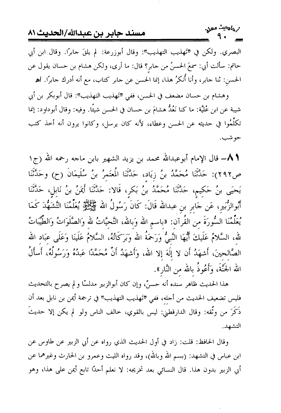 هذا الحديث ظاهر سنده أنه حسن وإن كان ابن الزبير مدلساً ولم يصرح بالتحديث فليس تضعيف الحديث من أجله ففي طتهذيب التهذيب" في ترجمة لأيمن بن نابل بعد أن ذكر من وثقه، وقال الدارقطنى: ليس بالقوى خالف الناس ولو لم يكن إلا حديث التشهد.