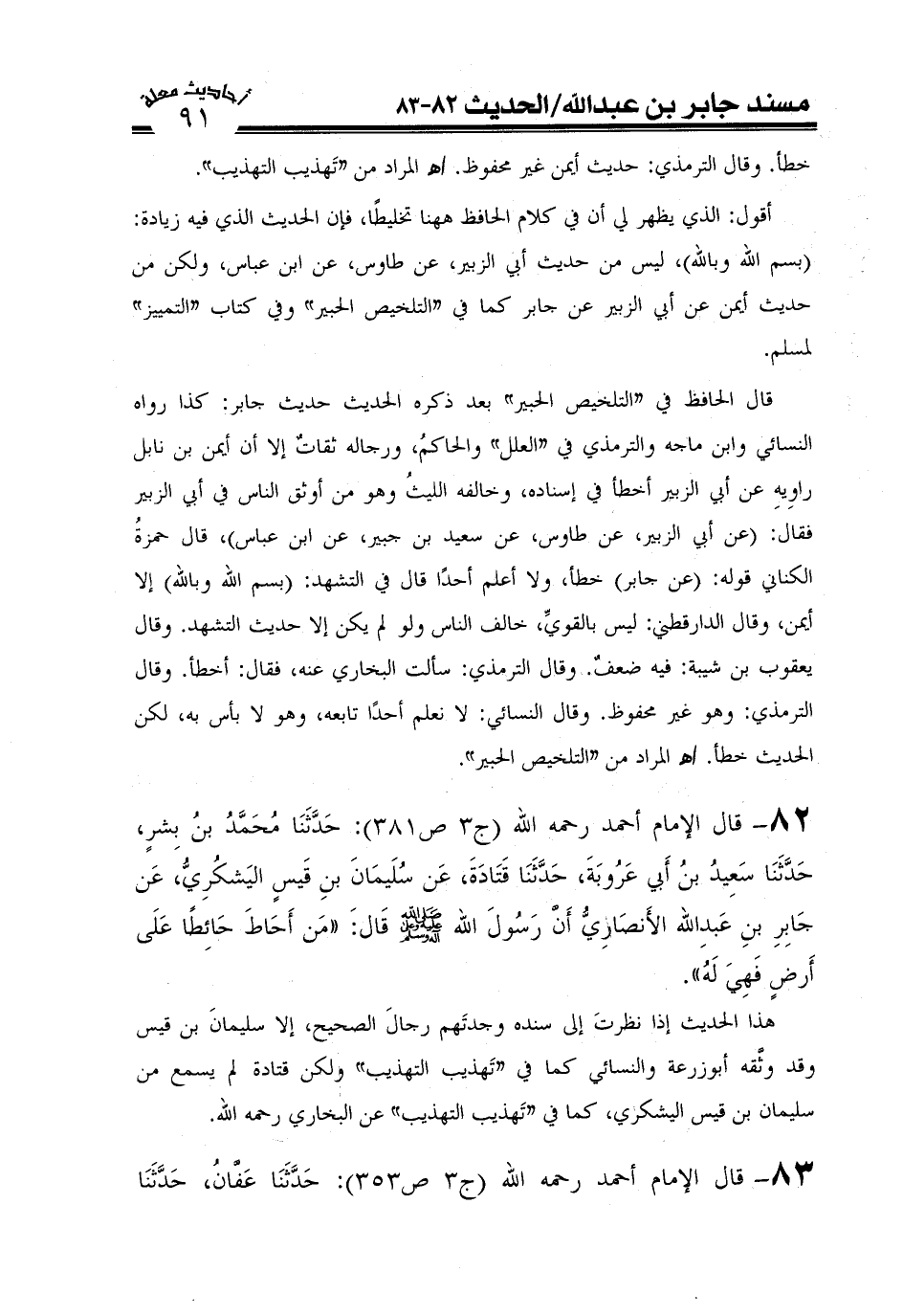 82- قال الإمام أحمد رحمه الله (ج3ص381) : حَدَّثَنَا مُحَمَّدُ بْنُ بِشْرٍ حَدَّثَنَا سَعِيدُ بْنُ أَبِي عَرُوبَةَ عَن قَتَادَةَ عَن سليمان بن قيس اليشكرى عن جابر بن عبد الله الأنصاري: أَنَّ رسول اللَّهِ صَلَّى اللَّهُ عَلَيْهِ وعلى آله وَسَلَّمَ قَالَ مَنْ أَحَاطَ حَائِطًا عَلَى أَرْضٍ فَهِيَ لَهُ.