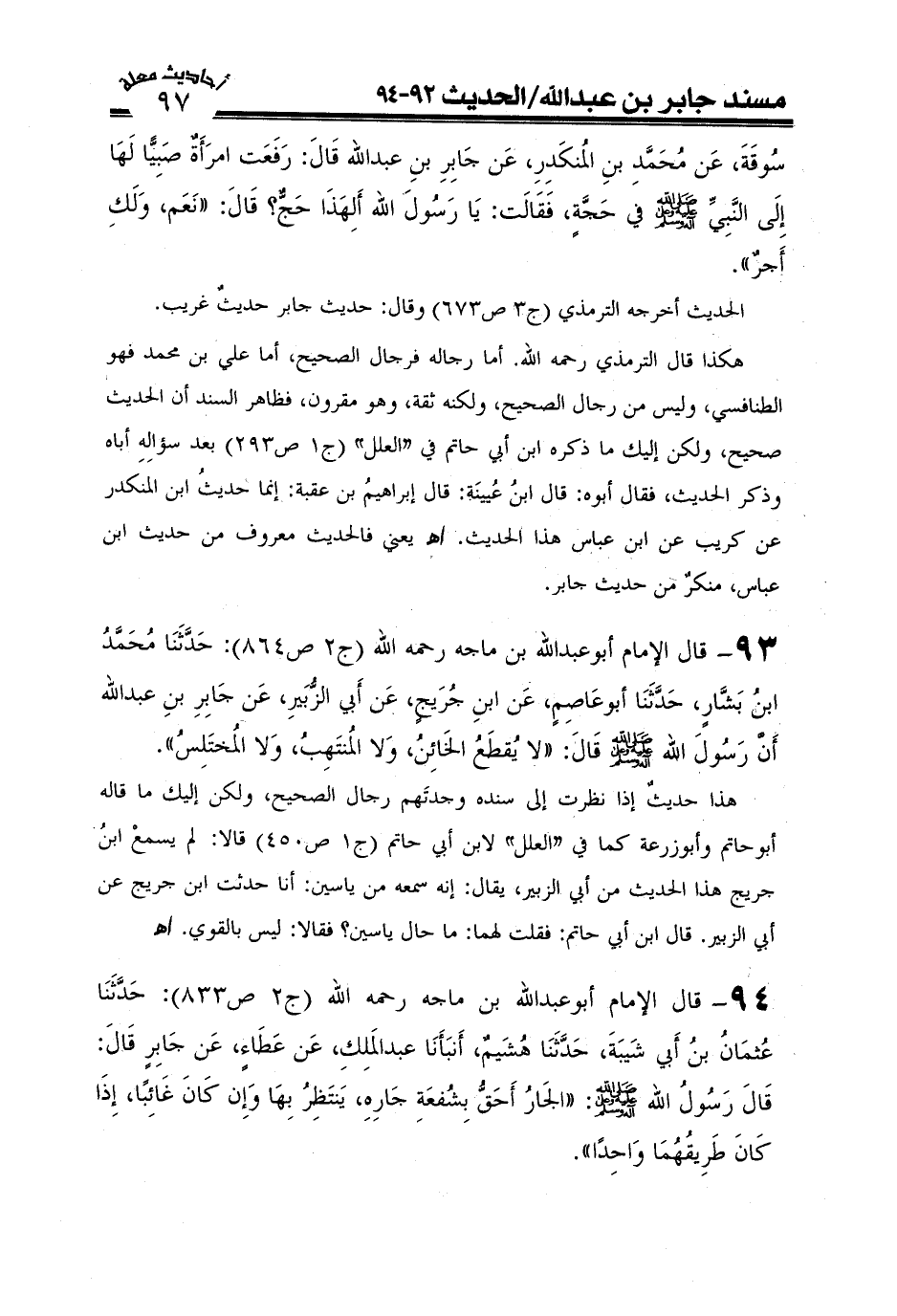 93-قال الإمام أبو عبد الله ابن ماجه رحمه الله (ج2ص864) : حَدَّثَنَا مُحَمَّدُ بْنُ بَشَّارٍ حَدَّثَنَا أَبُو عَاصِمٍ عَنْ ابْنِ جُرَيْجٍ عَنْ أَبِي الزُّبَيْرِ عَنْ جَابِرِ بْنِ عَبْدِ اللَّهِ أَنَّ رَسُولَ اللَّهِ صَلَّى اللَّهُ عَلَيْهِ وعلى آله وَسَلَّمَ قَالَ لَا يُقْطَعُ الْخَائِنُ وَلَا الْمُنْتَهِبُ وَلَا الْمُخْتَلِسُ.
