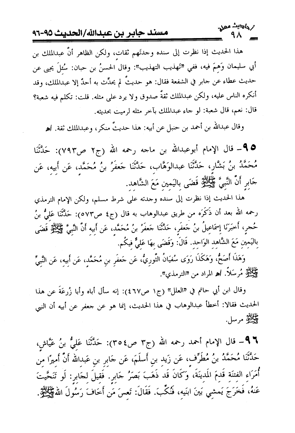 95-قال الإمام أبو عبد الله ابن ماجه رحمه الله (ج2ص793) : حَدَّثَنَا مُحَمَّدُ بْنُ بَشَّارٍ حَدَّثَنَا عَبْدُ الْوَهَّابِ حَدَّثَنَا جَعْفَرُ بْنُ مُحَمَّدٍ عَنْ أَبِيهِ عَنْ جَابِرٍ: أَنَّ النَّبِيَّ صَلَّى اللَّهُ عَلَيْهِ وعلى آله وَسَلَّمَ قَضَى بِالْيَمِينِ مَعَ الشَّاهِد.