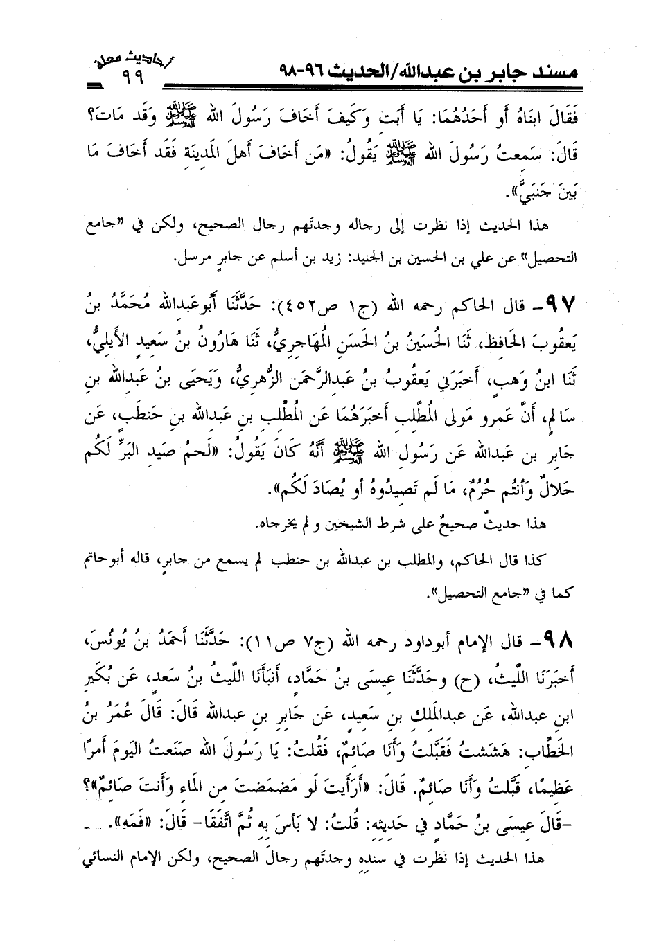 97-قال الحاكم رحمه الله (ج1ص452) : أخبرنا أبو عبد الله محمد بن يعقوب الحافظ، ثنا الحسين بن الحسن المهاجري، ثنا هارون بن سعيد الأيلي، ثنا ابن وهب، أخبرني يعقوب بن عبد الرحمن الزهري، ويحيى بن عبد الله بن سالم، أن عمر، مولى المطلب أخبرهما، عن المطلب بن عبد الله بن حنطب، عن جابر بن عبد الله، عن رسول الله صَلَّى اللَّهُ عَلَيْهِ وعلى آله وَسَلَّمَ أنه كان يقول: " لحم صيد البر لكم حلال، وأنتم حرم ما لم تصيدوه أو يصاد لكم "