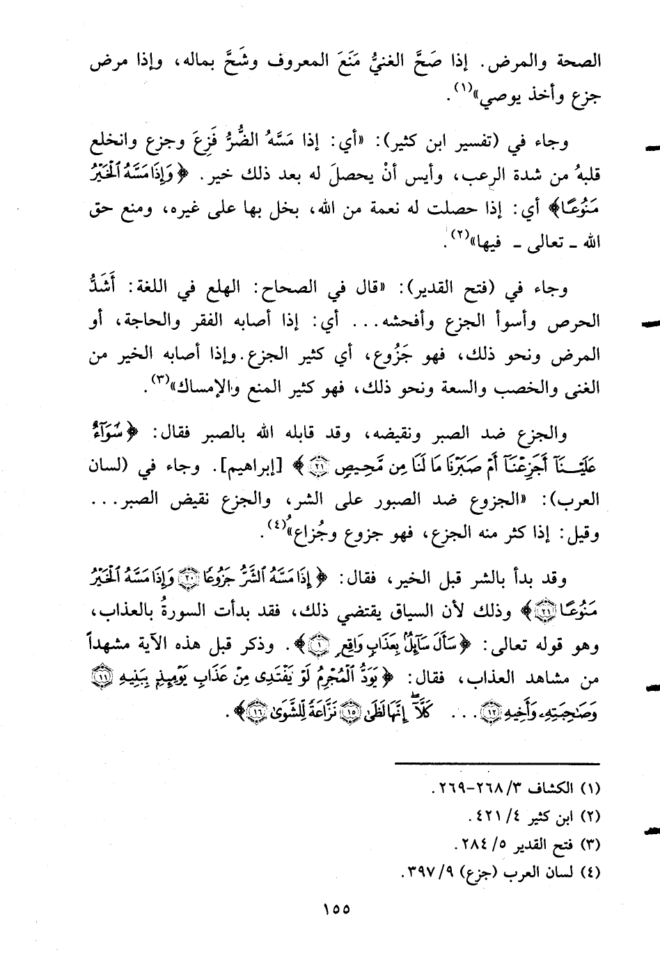 وجاء في (تفسير ابن كثير) : "أي: إذا مَسَّهُ الضُّرُّ فَزِعَ وجزع وانخلع قلبهُ من شدة الرعب، وأَيِسَ أنْ يحصلَ له بعد ذلك خير. {وَإِذَا مَسَّهُ الخير مَنُوعاً} أي: إذا حصلت له نعمة من الله، بخل بها على غيره، ومنعَ حقَّ الله - تعالى - فيها".