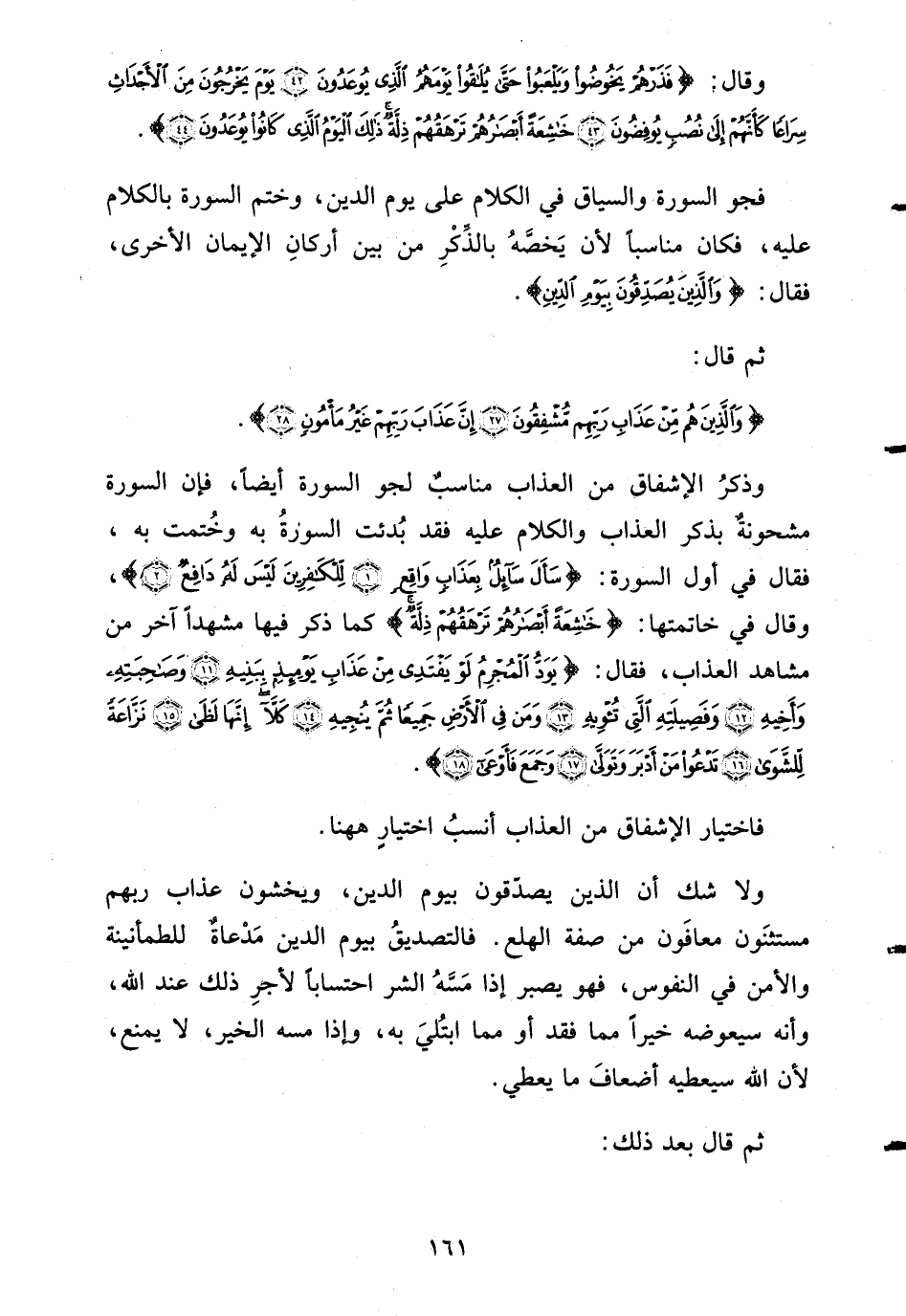 ولا شك أن الذين يصدّقون بيوم الدين، ويخشون عذاب ربهم مستثنَون معافَون من صفة الهلع. فالتصديقُ بيوم الدين مُدْعاةٌ للطمأنينة والأمن في النفوس، فهو يصبر إذا مَسَّهُ الشر احتساباً لأجرِ ذلك عند الله، وأنه سيعوضه خيراً مما فقد أو مما ابتُليَ به، وإذا مسه الخير، لا يمنع، لأن الله سيعطيه أضعافَ ما يعطي.