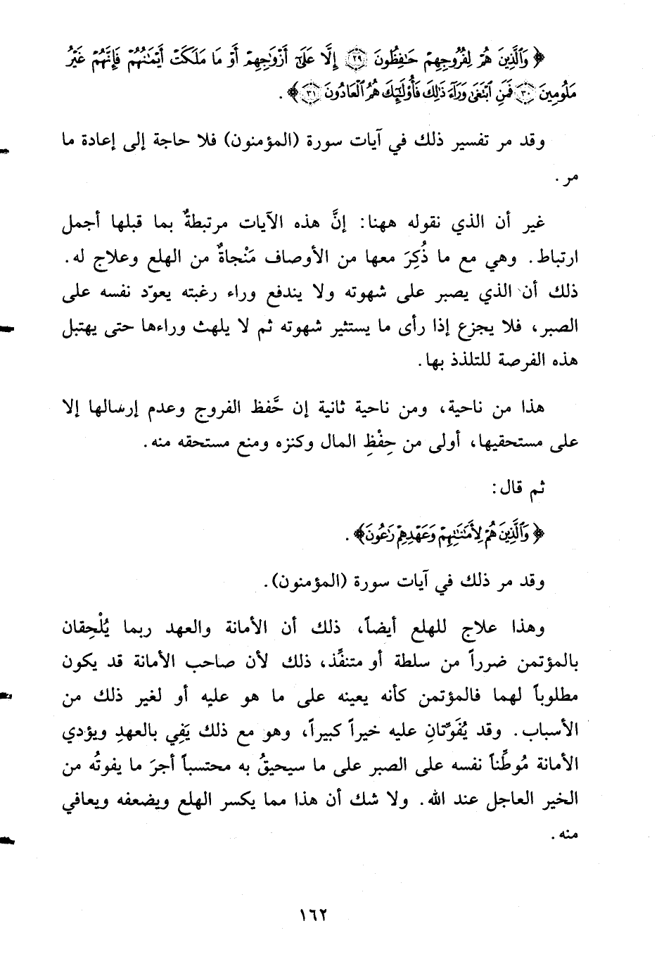 غير أن الذي نقوله ههنا: إنَّ هذه الآيات مرتبطةٌ بما قبلها أجمل ارتباط. وهي مع ما ذُكِرَ معها من الأوصاف مَنْجاةٌ من الهلع وعلاج له. ذلك أن الذي يصبر على شهوته ولا يندفع وراء رغبته يعوّد نفسه على الصبر، فلا يجزع إذا رأى ما يستثير شهوته ثم لا يلهث وراءها حتى يهتبل هذه الفرصة للتلذذ بها.
