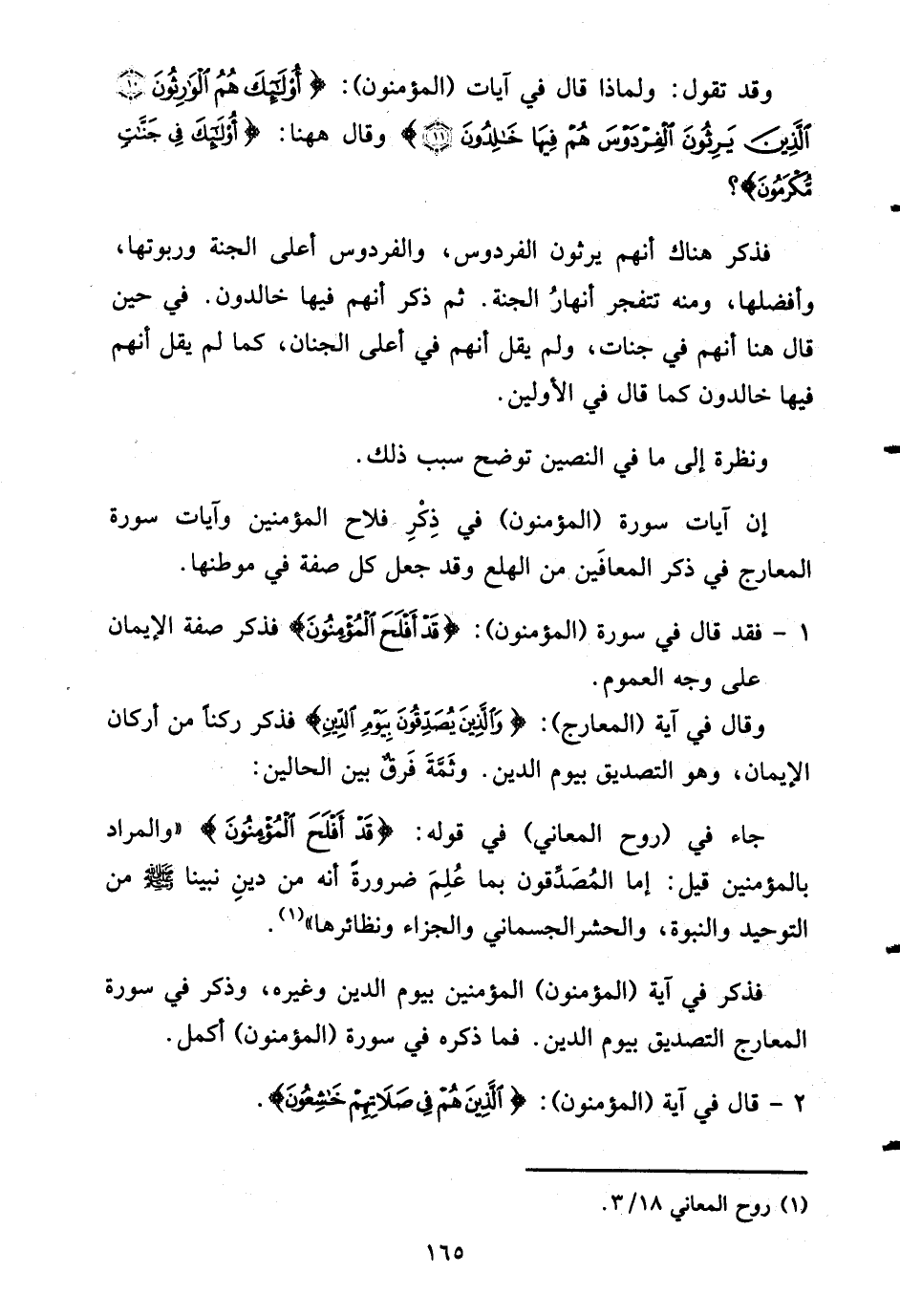 إن آيات سورة (المؤمنون) في ذِكْرِ فلاح المؤمنين وآيات سورة المعارج في ذكر المعافَين من الهلع وقد جعل كل صفة في موطنها.