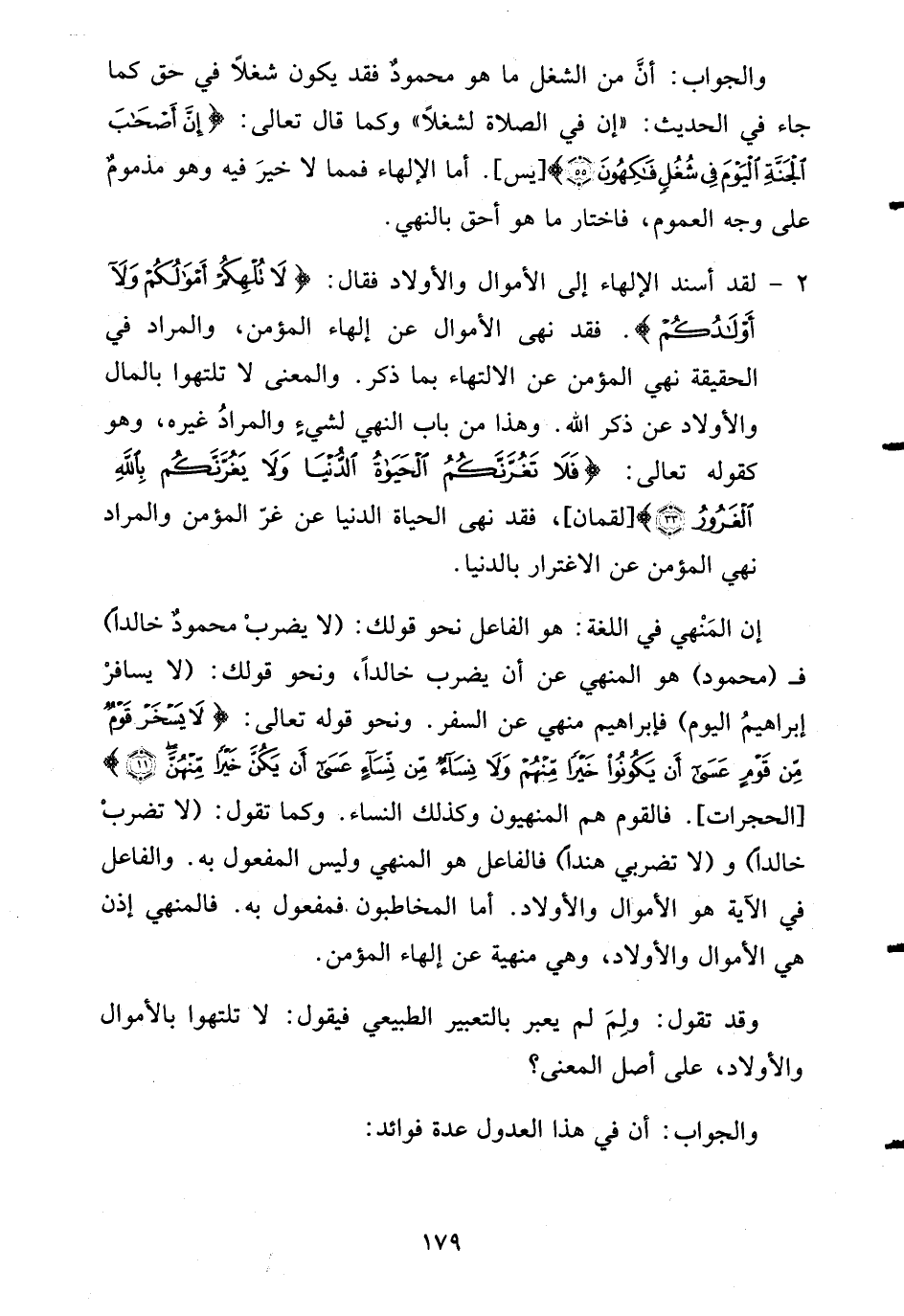 إن المَنْهي في اللغة: هو الفاعل نحو قولك: (لا يضربْ محمودٌ خالداً) فـ (محمود) هو المنهي عن أن يضرب خالداً، ونحو قولك: (لا يسافرْ إبراهيمُ اليوم) فإبراهيم منهي عن السفر. ونحو قوله تعالى: {ياأيها الذين آمَنُواْ لاَ يَسْخَرْ قَوْمٌ مِّن قَوْمٍ عسى أَن يَكُونُواْ خَيْراً مِّنْهُمْ وَلاَ نِسَآءٌ مِّن نِّسَآءٍ عسى أَن يَكُنَّ خَيْراً مِّنْهُنَّ} [الحجرات: 11] . فالقوم هم المنهيون وكذلك النساء. وكما تقول: (لا تضربْ خالداً) و (لا تضربي هنداً) فالفاعل هو المنهي وليس المفعول به. والفاعل في الآية هو الأموال والأولاد. أما المخاطبون فمفعول به. فالمنهي إذن هي الأموال والأولاد، وهي منهية عن إلهاء المؤمن.