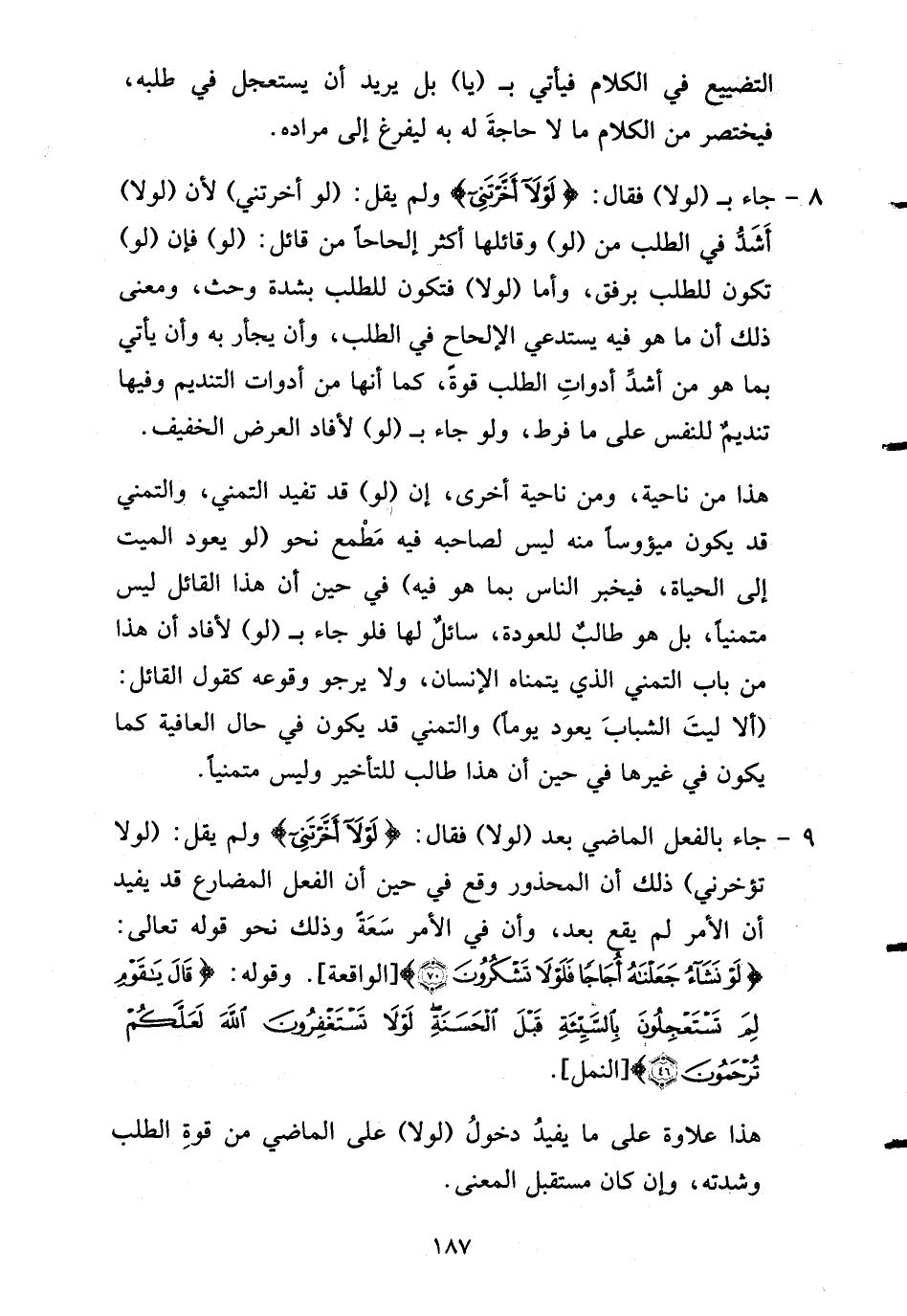 8- جاء بـ (لولا) فقال: {لولا أخرتنيا} ولم يقل: (لو أخرتني) لأن (لولا) أَشَدُّ في الطلب من (لو) وقائلها أكثر إلحاحاً من قائل: (لو) فإن (لو) تكون للطلب برفق، وأما (لولا) فتكون للطلب بشدةٍ وحَثٍّ، ومعنى ذلك أن ما هو فيه يستدعي الإلحاح في الطلب، وأن يجأر به وأن يأتي بما هو من أشدِّ أدواتِ الطلب قوةً، كما أنها من أدوات التنديم وفيها تنديمٌ للنفس على ما فرط، ولو جاء بـ (لو) لأفاد العرض الخفيف.