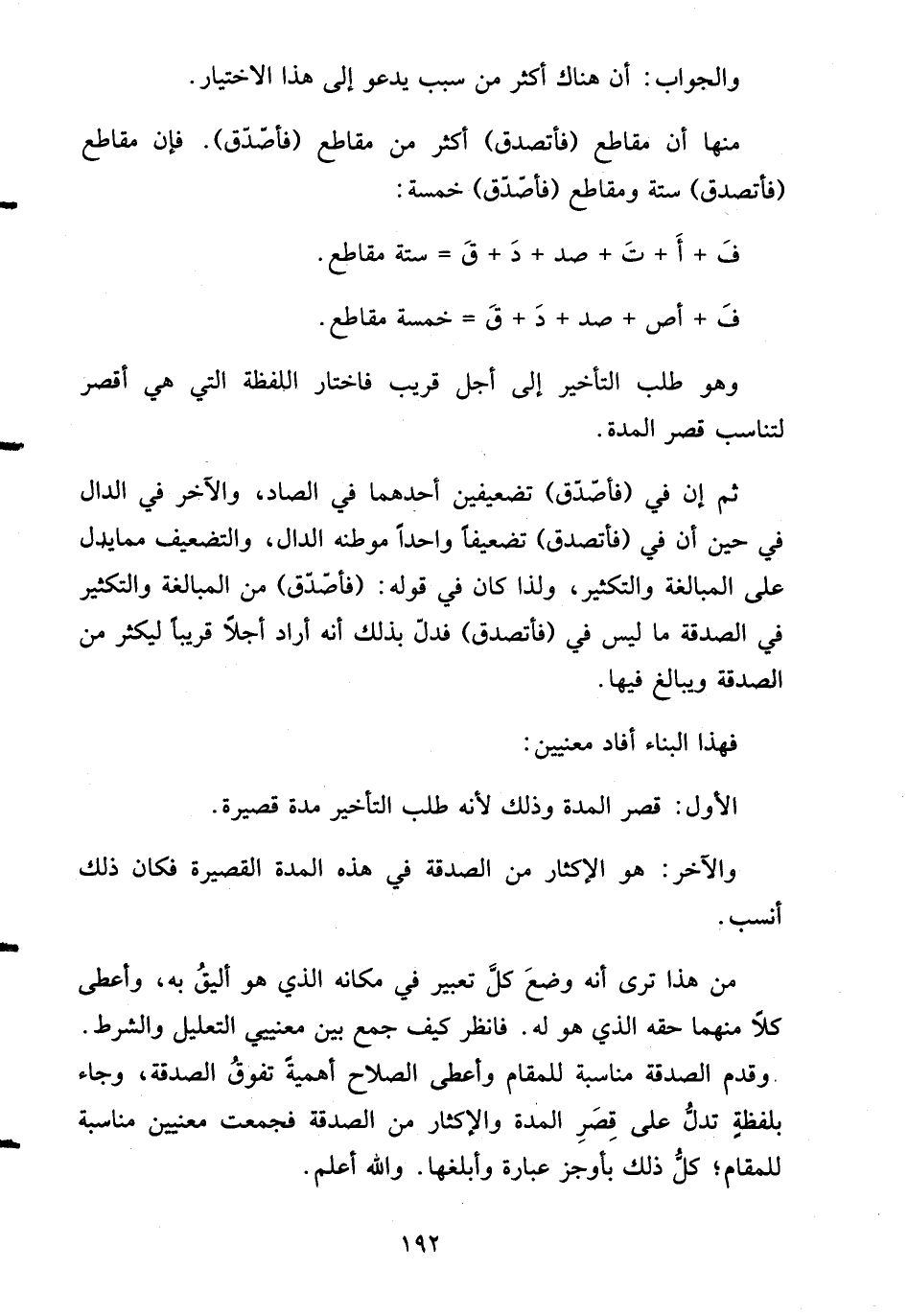 منها أن مقاطع (فأتصدق) أكثر من مقاطع (فأصّدّق) . فإن مقاطع (فأتصدق) ستة ومقاطع (فأصّدّق) خمسة: