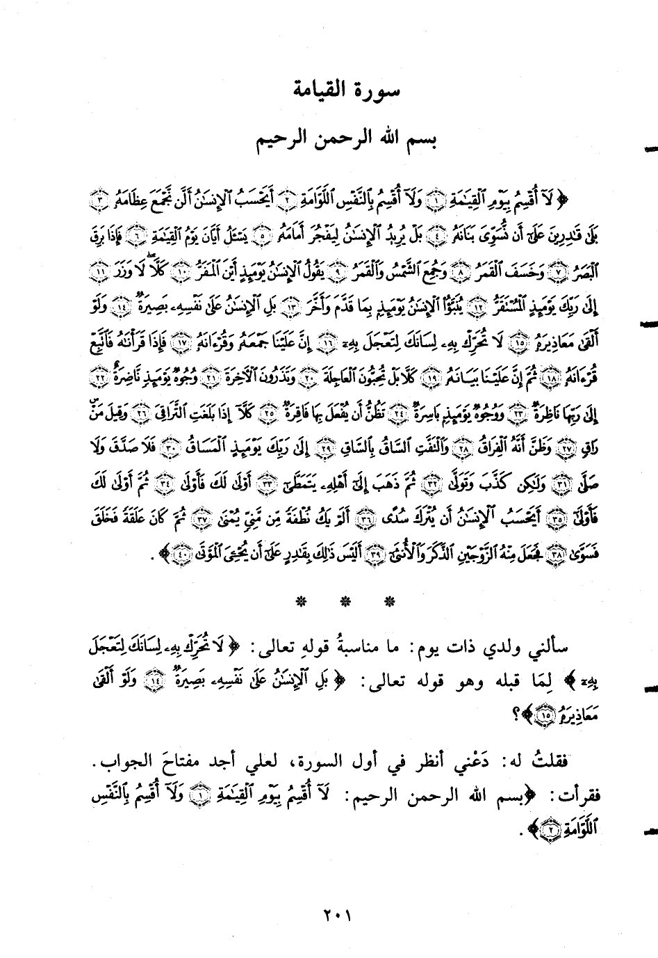فقلتُ له: دَعْني أنظر في أول السورة، لعلي أجد مفتاحَ الجواب. فقرأت: بسم الله الرحمن الرحيم: {لاَ أُقْسِمُ بِيَوْمِ القيامة * وَلاَ أُقْسِمُ بالنفس اللوامة} .