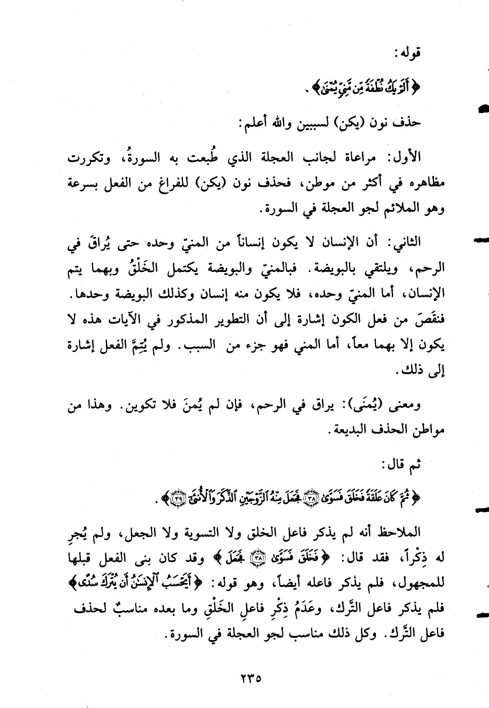 الثاني: أن الإنسان لا يكون إنساناً من المنيّ وحده حتى يُراقَ في الرحم، ويلتقي بالبويضة. فبالمنيّ والبويضة يكتمل الخَلْقُ وبهما يتم الإنسان، أما المنيّ وحده، فلا يكون منه إنسان وكذلك البويضة وحدها. فنقَصَ من فعل الكون إشارة إلى أن التطوير المذكور في الآيات هذه لا يكون إلا بهما معاً، أما المني فهو جزء من السبب. ولم يُتِمَّ الفعل إشارة إلى ذلك.