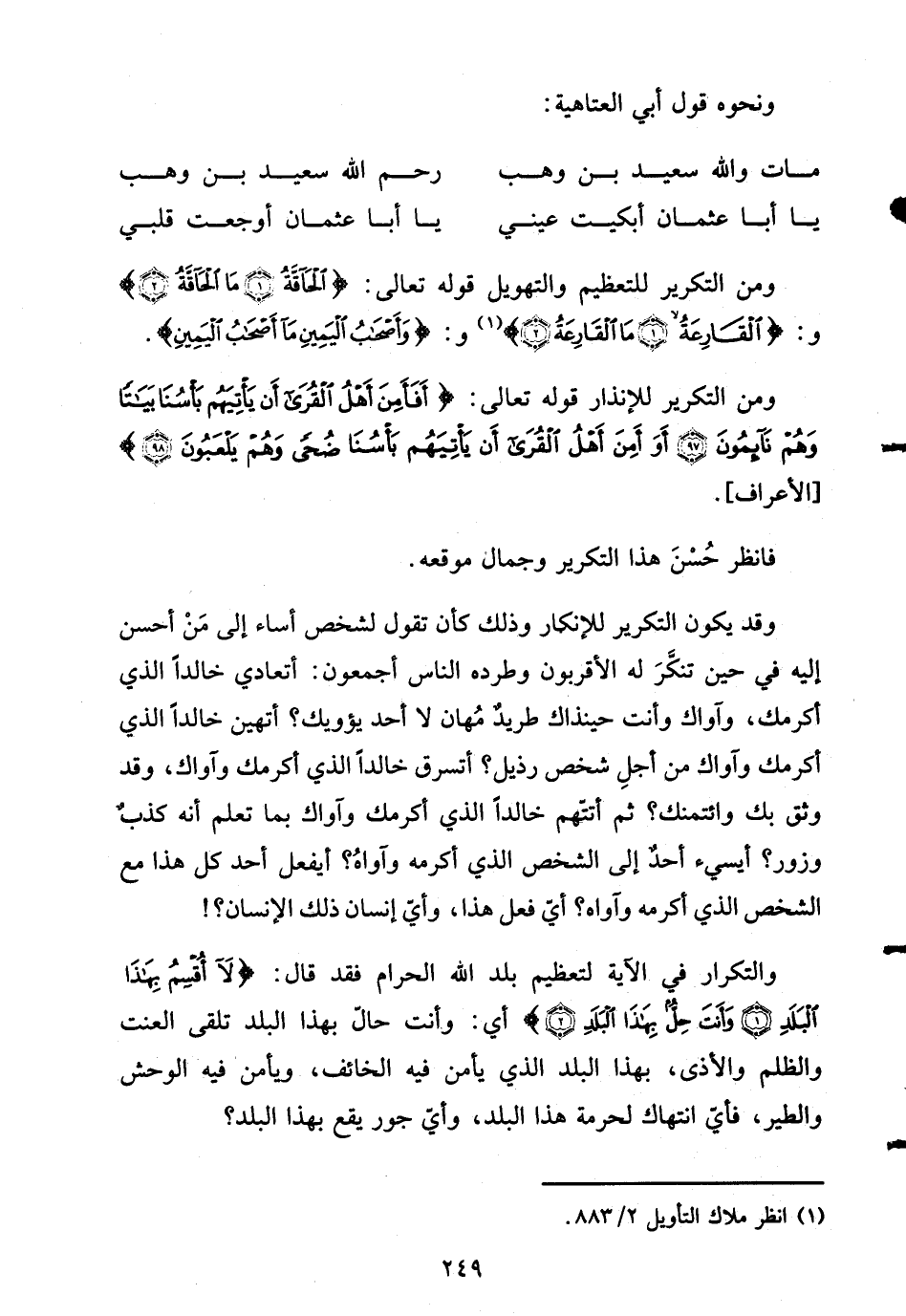 والتكرار في الآية لتعظيم بلد الله الحرام فقد قال: {لاَ أُقْسِمُ بهاذا البلد * وَأَنتَ حِلٌّ بهاذا البلد} أي: وأنت حالّ بهذا البلد تَلقى العنتَ والظلم والأذى، بهذا البلد الذي يأمن فيه الخائف، ويأمن فيه الوحش والطير، فأيّ انتهاك لحرمة هذا البلد، وأيّ جور يقع بهذا البلد؟