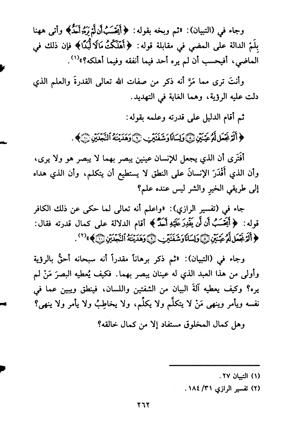 جاء في (تفسير الرازي) : "واعلم أنه تعالى لما حكى عن ذلك الكافر قوله: {أَيَحْسَبُ أَن لَّن يَقْدِرَ عَلَيْهِ أَحَدٌ} أقام الدلالة على كمال قدرته فقال: {أَلَمْ نَجْعَل لَّهُ عَيْنَيْنِ * وَلِسَاناً وَشَفَتَيْنِ * وَهَدَيْنَاهُ النجدين} .