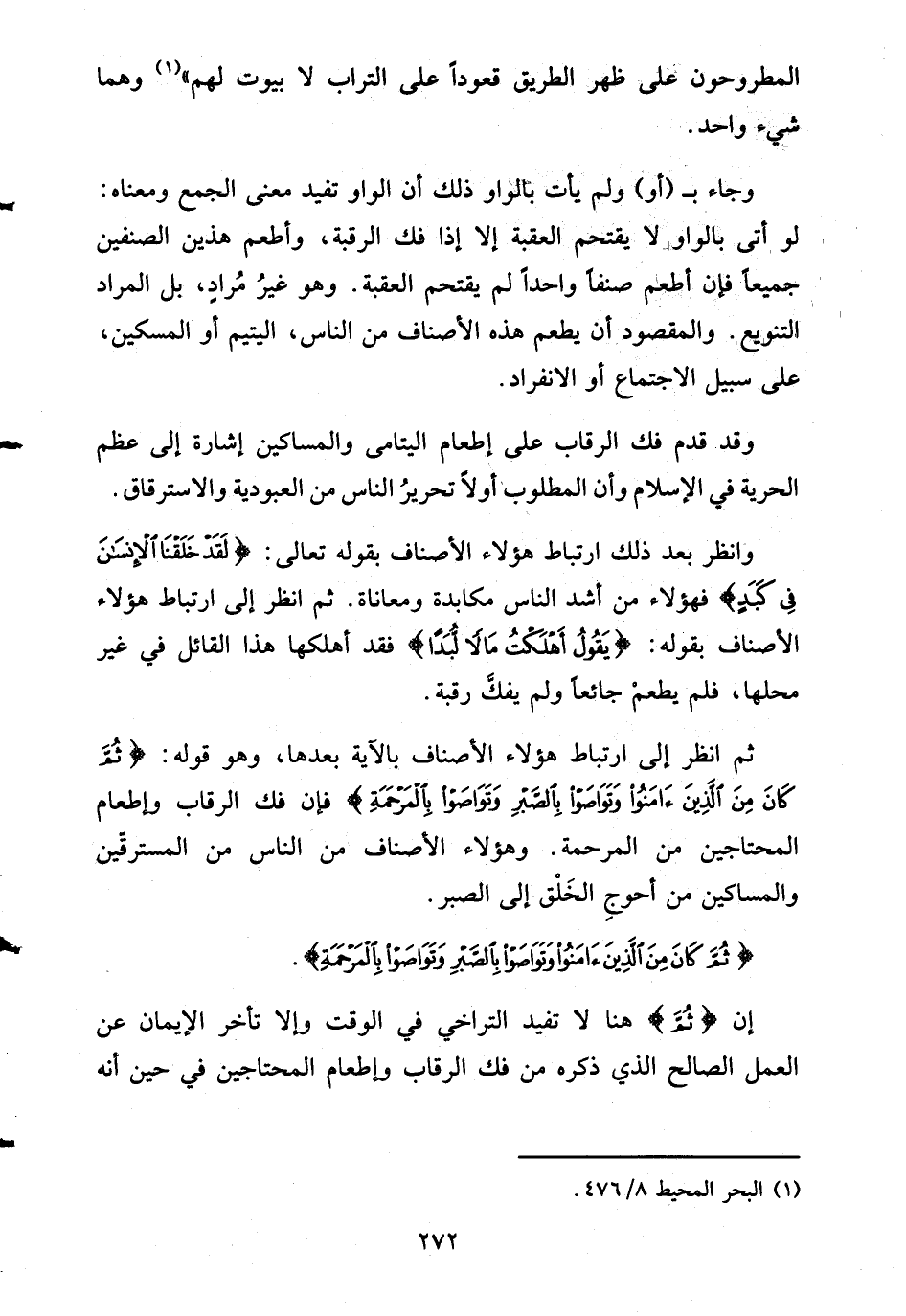 وانظر بعد ذلك ارتباط هؤلاء الأصناف بقوله تعالى: {لَقَدْ خَلَقْنَا الإنسان فِي كَبَدٍ} فهؤلاء من أشد الناس مكابدة ومعاناه. ثم انظر إلى ارتباط هؤلاء الأصناف بقوله: {يَقُولُ أَهْلَكْتُ مَالاً لُّبَداً} فقد أهلكها هذا القائل في غير محلها، فلم يطعمْ جائعاً ولم يفكَّ رقبة.