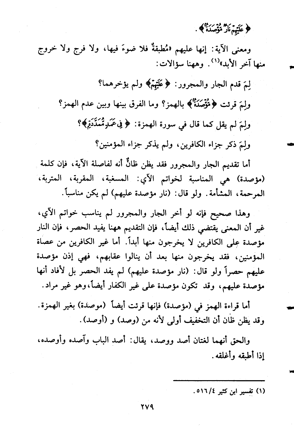 وهذا صحيح فإنه لو أخر الجار والمجرور لم يناسب خواتم الآي، غير أن المعنى يقتضي ذلك أيضاً، فإن التقديم ههنا يفيد الحصر، فإن النار مؤصدة على الكافرين لا يخرجون منها أبداً. أما غير الكافرين من عصاة المؤمنين، فقد يخرجون منها بعد أن ينالوا عقابهم، فهي إذن مؤصدة عليهم حصراً ولو قال: (نار مؤصدة عليهم) لم يفد الحصر بل لأفاد أنها مؤصدة عليهم، وقد تكون مؤصدة على غير الكفار أيضاً، وهو غير مراد.