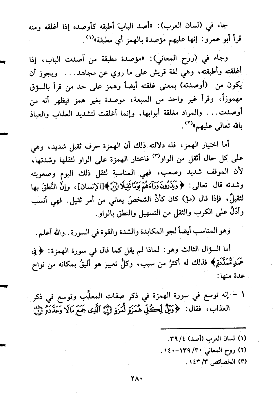 وجاء في (روح المعاني) : "مؤصدة مطبقة من آصدت الباب، إذا أغلقته وأطبقته، وهي لغة قريش على ما روي عن مجاهد.. ويجوز أن يكون من (أوصدته) بمعنى غلقته أيضاً وهمز على حد من قرأ بالسؤق مهموزاً، وقرأ غير واحد من السبعة، موصدة بغير همز فيظهر أنه من أوصدت.. والمراد مغلقة أبوابها، وإنما أغلقت لتشديد العذاب والعياذ بالله تعالى عليهم".