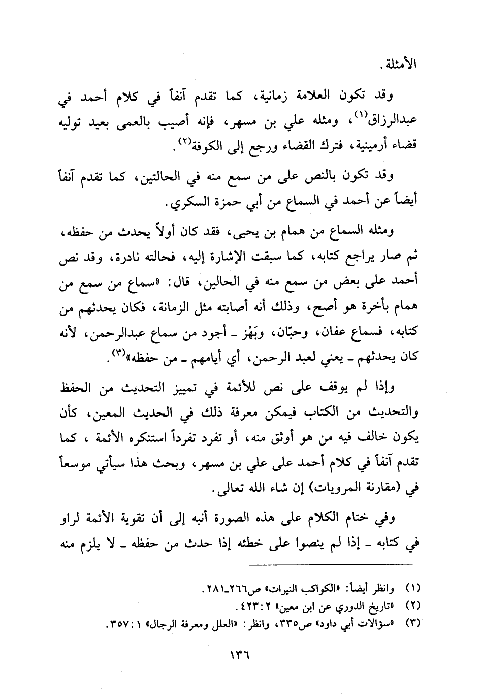 ومثله السماع من همام بن يحيى، فقد كان أولا يحدث من حفظه، ثم صار يراجع كتابه، كما سبقت الإشارة إليه، فحالته نادرة، وقد نص أحمد على بعض من سمع منه في الحالتين، قال: "سماع من سمع من همام بأخرة هو أصح، وذلك أنه أصابته مثل الزمانة، فكان يحدثهم من كتابه، فسماع عفان، وحَبَّان، وبَهْز، أجود من سماع عبد الرحمن، لأنه كان يحدثهم -يعني لعبد الرحمن، أي أيامهم- من حفظه" (¬٣).