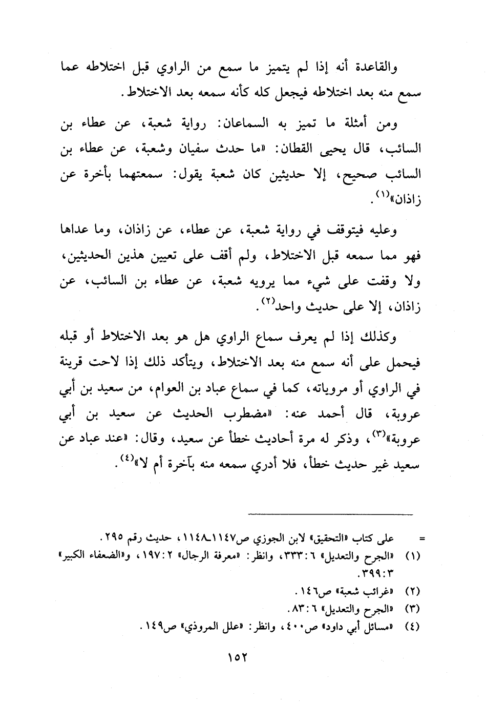 وكذلك إذا لم يعرف سماع الراوي هل هو بعد الاختلاط أو قبله فيحمل على أنه سمع منه بعد الاختلاط، ويتأكد ذلك إذا لاحت قرينة في الراوي أو مروياته، كما في سماع عَبَّاد بن العَوَّام، من سعيد بن أبي عروبة، قال أحمد عنه: "مضطرب الحديث عن سعيد بن أبي عَرُوبة" (¬٣)، وذكر له مرة أحاديث خطأ عن سعيد، وقال: "عند عباد عن سعيد غير حديث خطأ، فلا أدري سمعه منه بآخره أم لا" (¬٤).