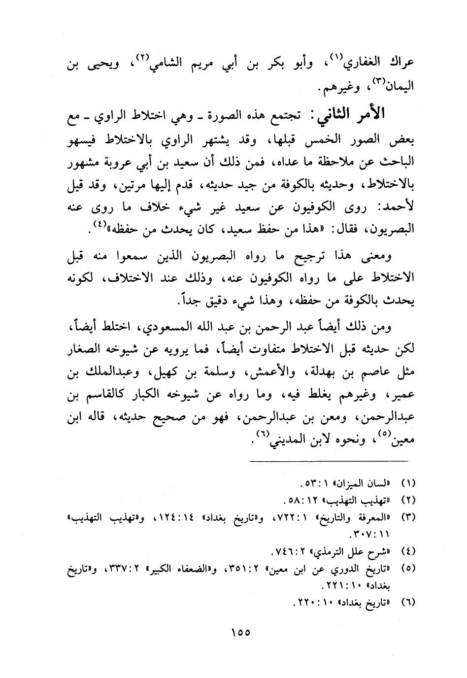 الأمر الثاني: تجتمع هذه الصورة -وهي اختلاط الراوي- مع بعض الصور الخمس قبلها، وقد يشتهر الراوي بالاختلاط فيسهو الباحث عن ملاحظة ما عداه، فمن ذلك أن سعيد بن أبي عَرُوبة مشهور بالاختلاط، وحديثه بالكوفة من جيد حديثه، قدم إليها مرتين، وقد قيل لأحمد: روى الكوفيون عن سعيد غير شيء خلاف ما روى عنه البصريون، فقال: "هذا من حفظ سعيد، كان يحدث من حفظه" (¬٤).