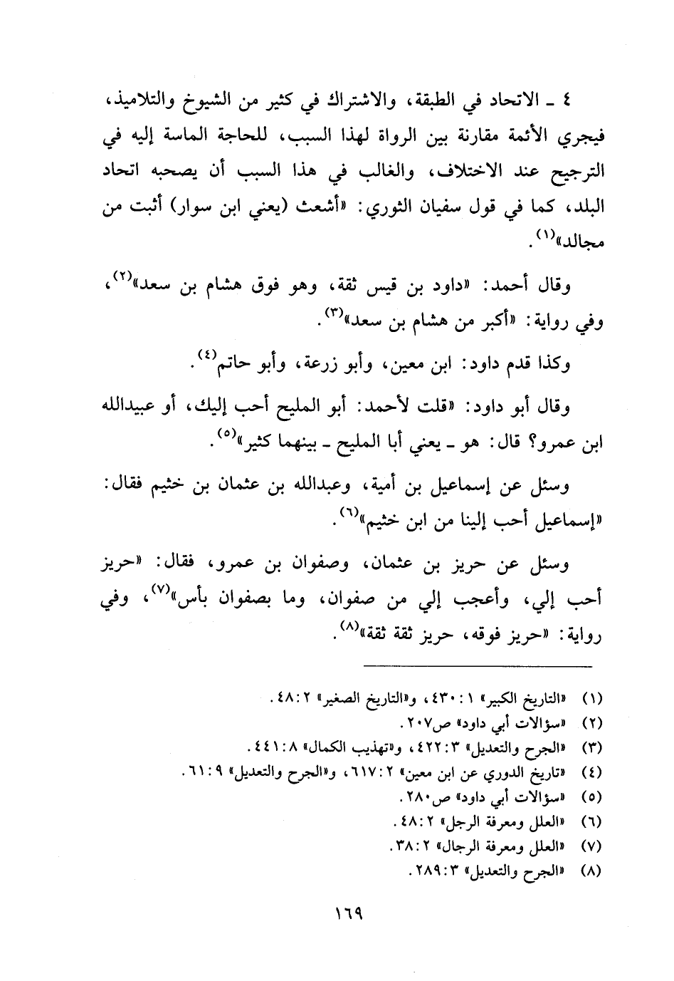 ٤ - الاتحاد في الطبقة، والاشتراك في كثير من الشيوخ والتلاميذ، فيجري الأئمة مقارنة بين الرواة لهذا السبب، للحاجة الماسة إليه في الترجيح عند الاختلاف، والغالب في هذا السبب أن يصحبه اتحاد البلد، كما في قول سفيان الثوري: "أشعث (يعني ابن سَوَّار) أثبت من مُجَالِد" (¬١).