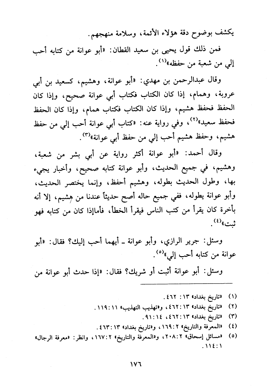 وقال عبد الرحمن بن مهدي: "أبو عَوَانة، وهُشَيْم، كسعيد بن أبي عَرُوبة، وهمام، إذا كان الكتاب فكتاب أبي عَوَانة صحيح، وإذا كان الحفظ فحفظ هُشَيْم، وإذا كان الكتاب فكتاب همام، وإذا كان الحفظ فحفظ سعيد" (¬٢)، وفي رواية عنه: "كتاب أبي عَوَانة أحب إلي من حفظ هُشَيْم، وحفظ هُشَيْم أحب إلي من حفظ أبي عَوَانة" (¬٣).