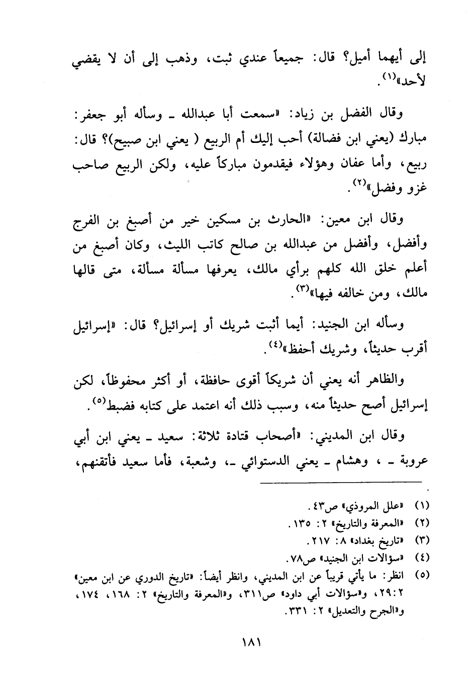 (¬٥) انظر: ما يأتي قريبا عن ابن المديني، وانظر أيضا: "تاريخ الدوري عن ابن معين"٢: ٢٩، و"سؤالات أبي داود" ص ٣١١، و"المعرفة والتاريخ"٢: ١٦٨، ١٧٤، و"الجرح والتعديل"٢: ٣٣١.