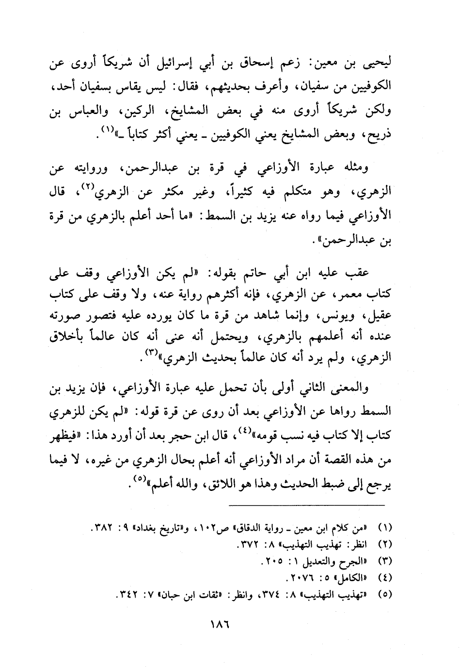 ومثله عبارة الأوزاعي في قُرَّة بن عبد الرحمن، وروايته عن الزهري، وهو متكلم فيه كثيرا، وغير مكثر عن الزهري (¬٢)، قال الأوزاعي فيما رواه عنه يزيد بن السِّمْط: "ما أحد أعلم بالزهري من قُرَّة بن عبد الرحمن".