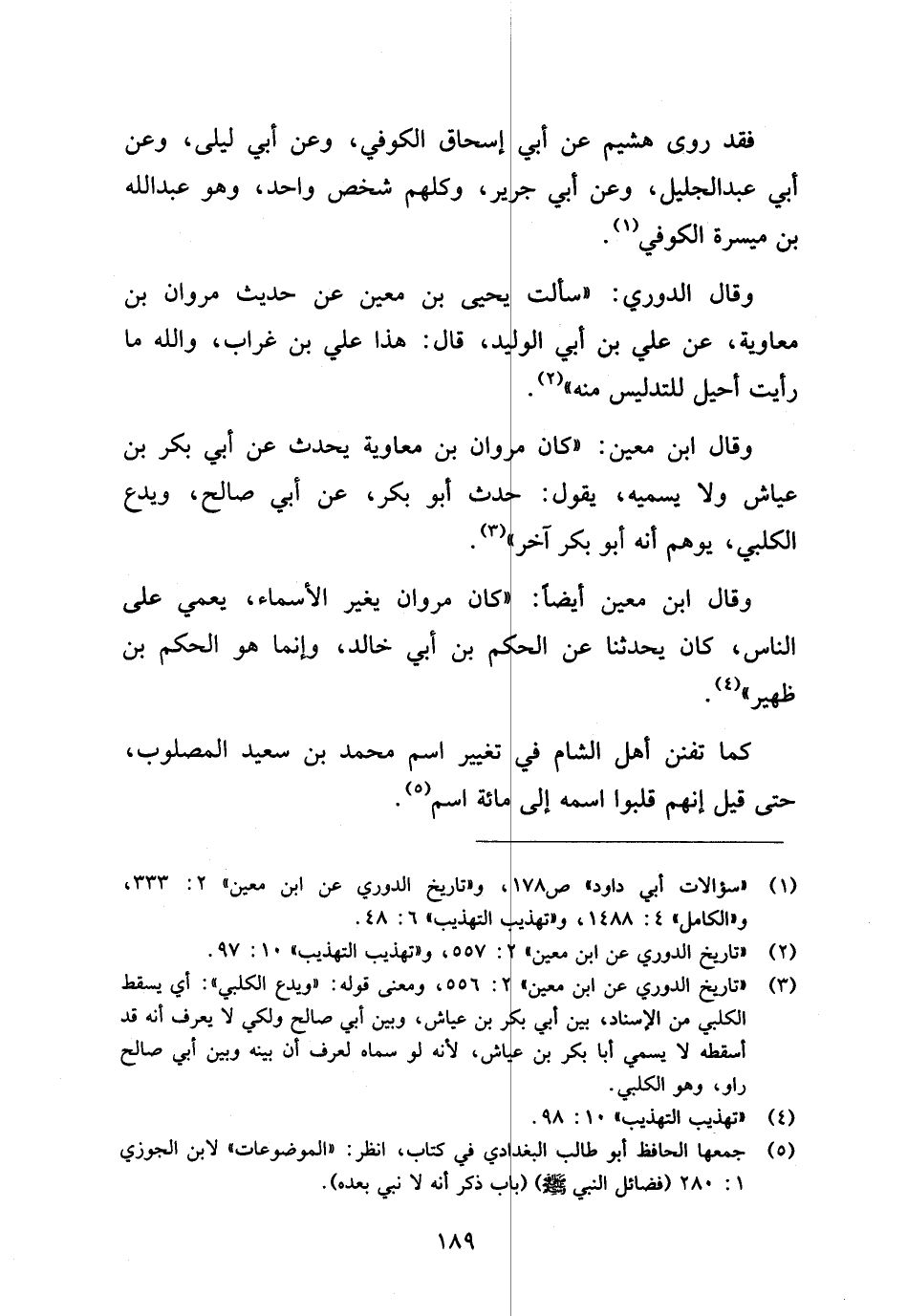(¬٣) "تاريخ الدوري عن ابن معين"٢: ٥٥٦، ومعنى قوله: "ويدع الكلبي": أي يسقط الكلبي من الإسناد، بين أبي بكر بن عياش، وبين أبي صالح، ولكي لا يعرف أنه أسقطه لا يسمي أبا بكر بن عياش، يعني لا يذكر نسبته وأنه ابن عياش، لأنه لو سماه لعرف أن بينه وبين أبي صالح راو، وهو الكلبي.