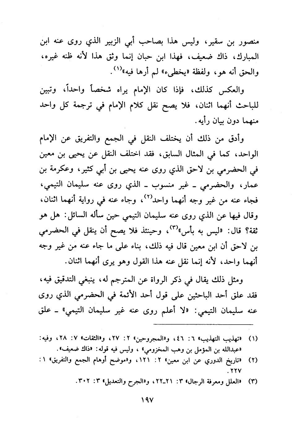 وأدق من ذلك أن يختلف النقل في الجمع والتفريق عن الإمام الواحد، كما في المثال السابق، فقد اختلف النقل عن يحيى بن معين في الحضرمي بن لاحق الذي روى عنه يحيى بن أبي كثير، وعكرمة بن عمار، والحضرمي -غير منسوب- الذي روى عنه سليمان التيمي، فجاء عنه من غير وجه أنهما واحد (¬٢)، وجاء عنه في رواية أنهما اثنان، وقال فيها عن الذي روى عنه سليمان التيمي حين سأله السائل: هل هو ثقة؟ قال: "ليس به بأس" (¬٣)، وحينئذ فلا يصح أن ينقل في الحضرمي بن لاحق أن ابن معين قال فيه ذلك، بناء على ما جاء عنه من غير وجه أنهما واحد، لأنه إنما نقل عنه هذا القول وهو يرى أنهما اثنان.