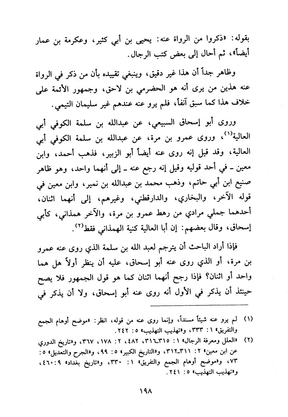 وروى أبو إسحاق السَّبِيعي، عن عبد الله بن سلمة الكوفي أبي العالية (¬١)، وروى عمرو بن مُرَّة، عن عبد الله بن سلمة الكوفي أبي العالية، وقد قيل إنه روى عنه أيضا أبو الزبير، فذهب أحمد، وابن معين -في أحد قوليه وقيل إنه رجع عنه- إلى أنهما واحد، وهو ظاهر صنيع ابن أبي حاتم، وذهب محمد بن عبد الله بن نمير، وابن معين في قوله الآخر، والبخاري، والدارقطني، وغيرهم، إلى أنهما اثنان، أحدهما جملي مرادي من رهط عمرو بن مُرَّة، والآخر همذاني، كأبي إسحاق، وقال بعضهم: إن أبا العالية كنية الهمذاني فقط (¬٢).