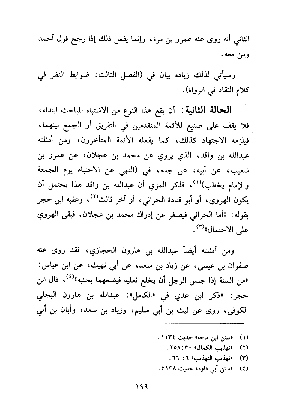 الحالة الثانية: أن يقع هذا النوع من الاشتباه للباحث ابتداء، فلا يقف على صنيع للأئمة المتقدمين في التفريق أو الجمع بينهما، فيلزمه الاجتهاد كذلك، كما يفعل الأئمة المتأخرون، ومن أمثلته عبد الله بن واقد، الذي يروي عن محمد بن عجلان، عن عمرو بن شعيب، عن أبيه، عن جده، في (النهي عن الاحتباء يوم الجمعة والإمام يخطب) (¬١)، فذكر المِزِّي أن عبد الله بن واقد هذا يحتمل أن يكون الهروي، أو أبو قتادة الحَرَّاني، أو آخر ثالث (¬٢)، وعقبه ابن حجر بقوله: "أما الحَرَّاني فيصغر عن إدراك محمد بن عجلان، فبقي الهروي على الاحتمال" (¬٣).