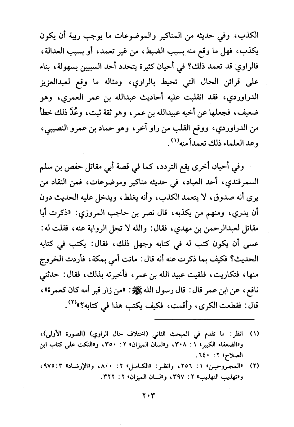 الكذب، وفي حديثه من المناكير والموضوعات ما يوجب ريبة أن يكون يكذب، فهل ما وقع منه بسبب الضبط، من غير تعمد، أو بسبب العدالة، فالراوي قد تعمد ذلك؟ في أحيان كثيرة يتحدد أحد السببين بسهولة، بناء على قرائن الحال التي تحيط بالراوي، ومثاله ما وقع لعبد العزيز الداروردي، فقد انقلبت عليه أحاديث عبد الله بن عمر العمري، وهو ضعيف، فجعلها عن أخيه عبيد الله بن عمر، وهو ثقة ثبت، وعُد ذلك خطأ من الداروردي، ووقع القلب من راو آخر، وهو حماد بن عمرو النصيبي، وعد العلماء ذلك تعمدا منه (¬١).