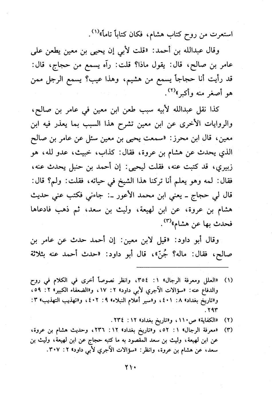 (¬٣) "معرفة الرجال"١: ٥٢، و"تاريخ بغداد"١٢: ٢٣٦، وحديث هشام بن عروة، عن ابن لهيعة، وليث بن سعد، المقصود به ما كتبه حجاج، عن ابن لهيعة، وليث بن سعد، عن هشام بن عروة، وانظر: "سؤالات الآجري لأبي داود"٢: ٣٠٧.