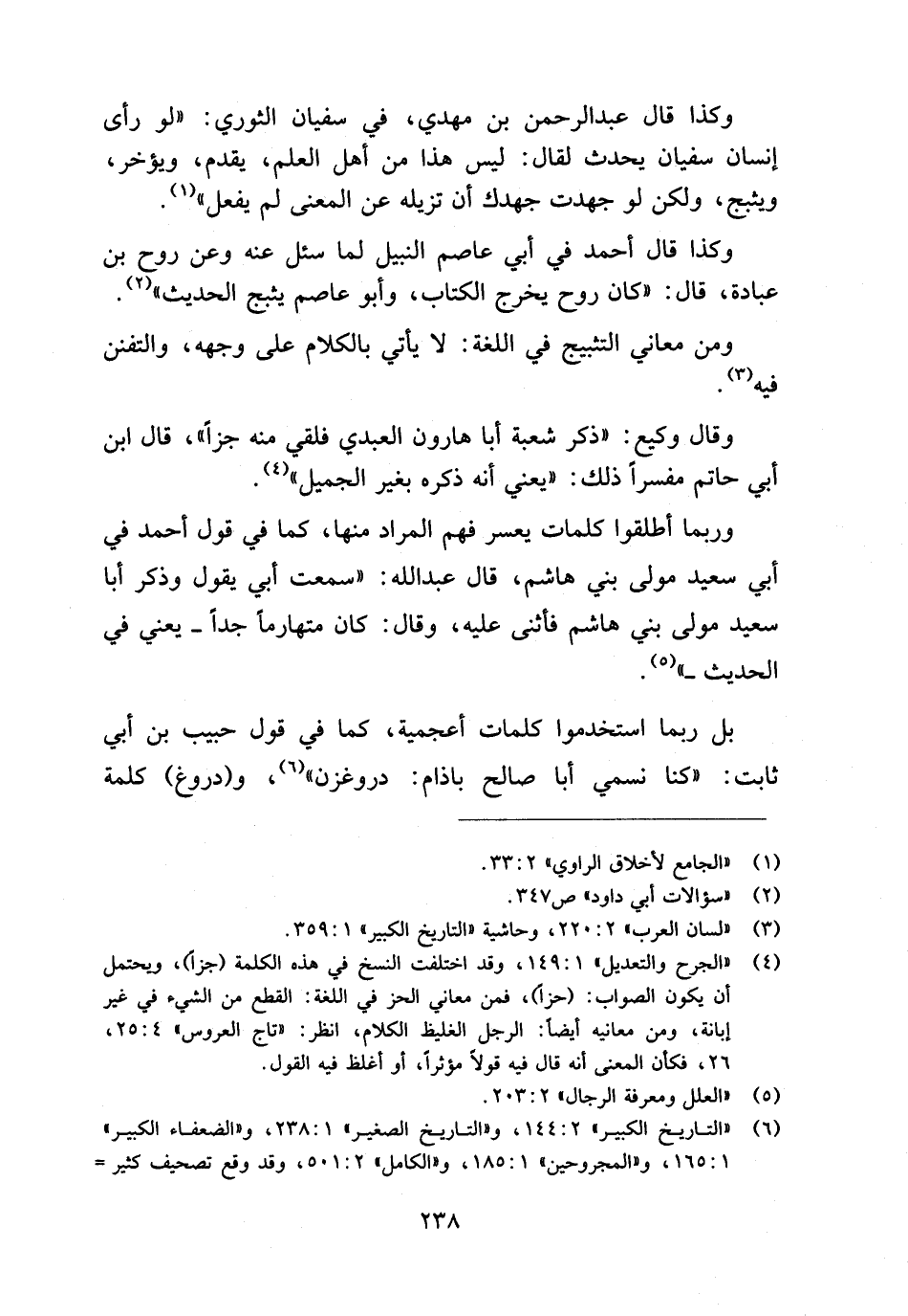 (¬٦) "التاريخ الكبير"٢: ١٤٤، و"التاريخ الصغير"١: ٢٣٨، و"الضعفاء الكبير"١: ١٦٥، و"المجروحين"١: ١٨٥، و"الكامل"٢: ٥٠١، وقد وقع تصحيف كثير في هذه الكلمة في المصادر، انظر أيضا: "أحوال الرجال" ص ٨٨.