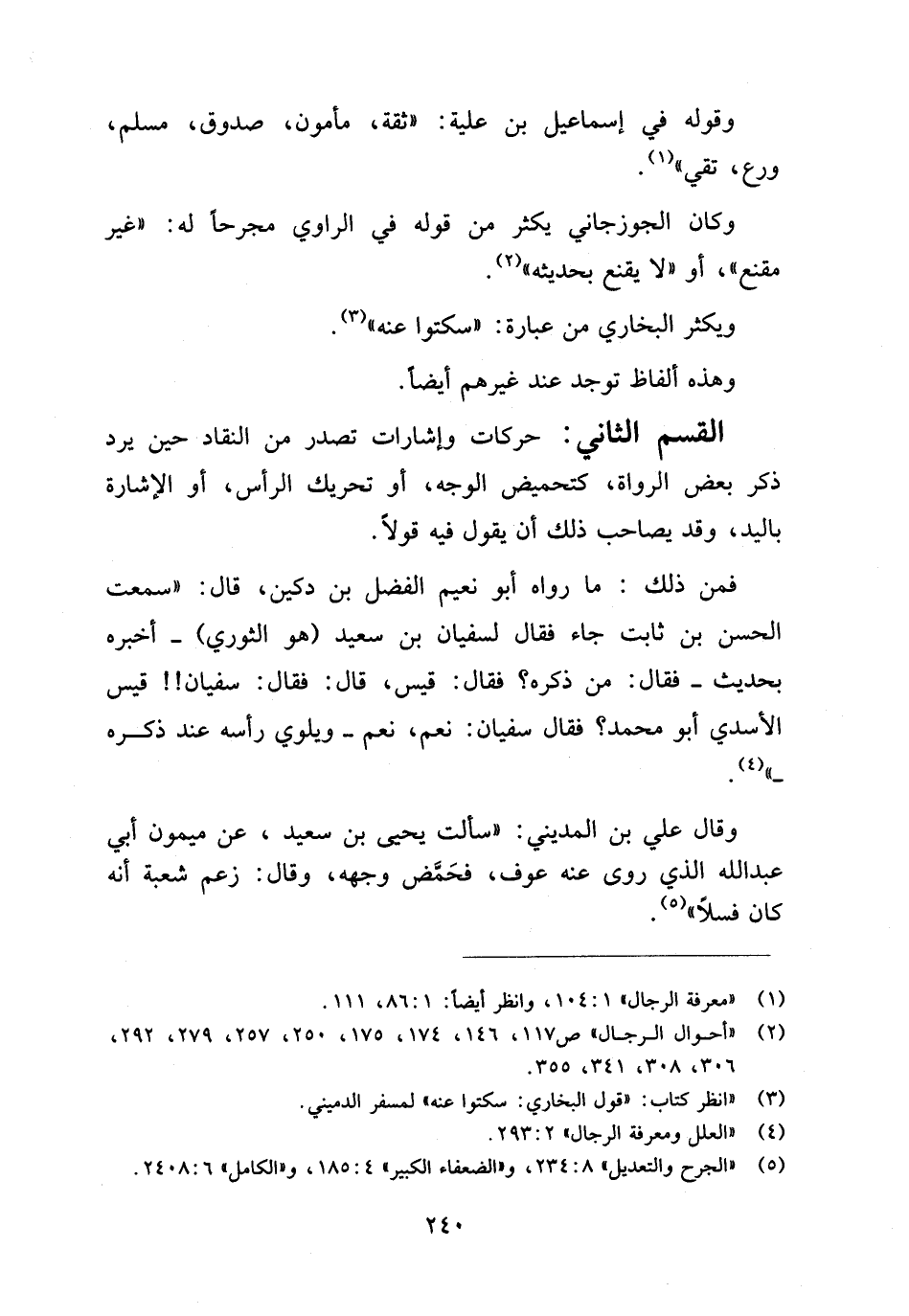 القسم الثاني: حركات وإشارات تصدر من النقاد حين يرد ذكر بعض الرواة، كتحميض الوجه، أو تحريك الرأس، أو الإشارة باليد، وقد يصاحب ذلك أن يقول فيه قولا.